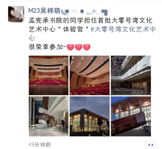 “音响效果极好,观看体验拉满,这样的场地可以容纳更多向往观看艺术类演出的同学。十分期待能在大零号湾文化艺术中心演出!”
