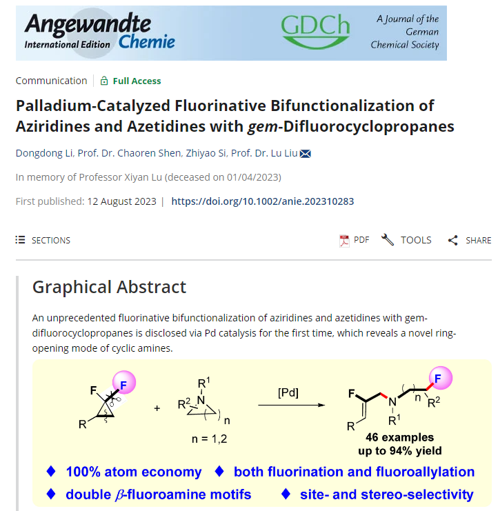 化学与分子工程学院刘路教授利用“绿色分子编辑”,发展了一个氟代双官能团化反应,实现了碳氟键的精准断裂与重组,以100%原子经济性合成了一系列二氟氨基化合物,为含氟药物、含氟农药以及含氟材料的进一步开发提供丰富的化合物库。