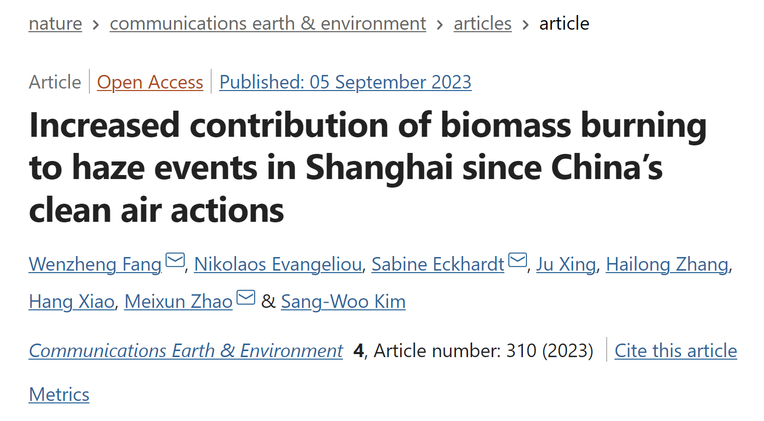 论文在自然出版集团期刊Communications Earth & Environment上发表。方文政研究员担任第一作者,与挪威空气研究所Sabine Eckhardt 博士、中国海大赵美训教授担任论文的共同通讯作者。该文是团队在7月自然合作期刊Climate and Atmospheric Science上发表针对“大气污染问题”的阶段性成果后的又一研究进展。