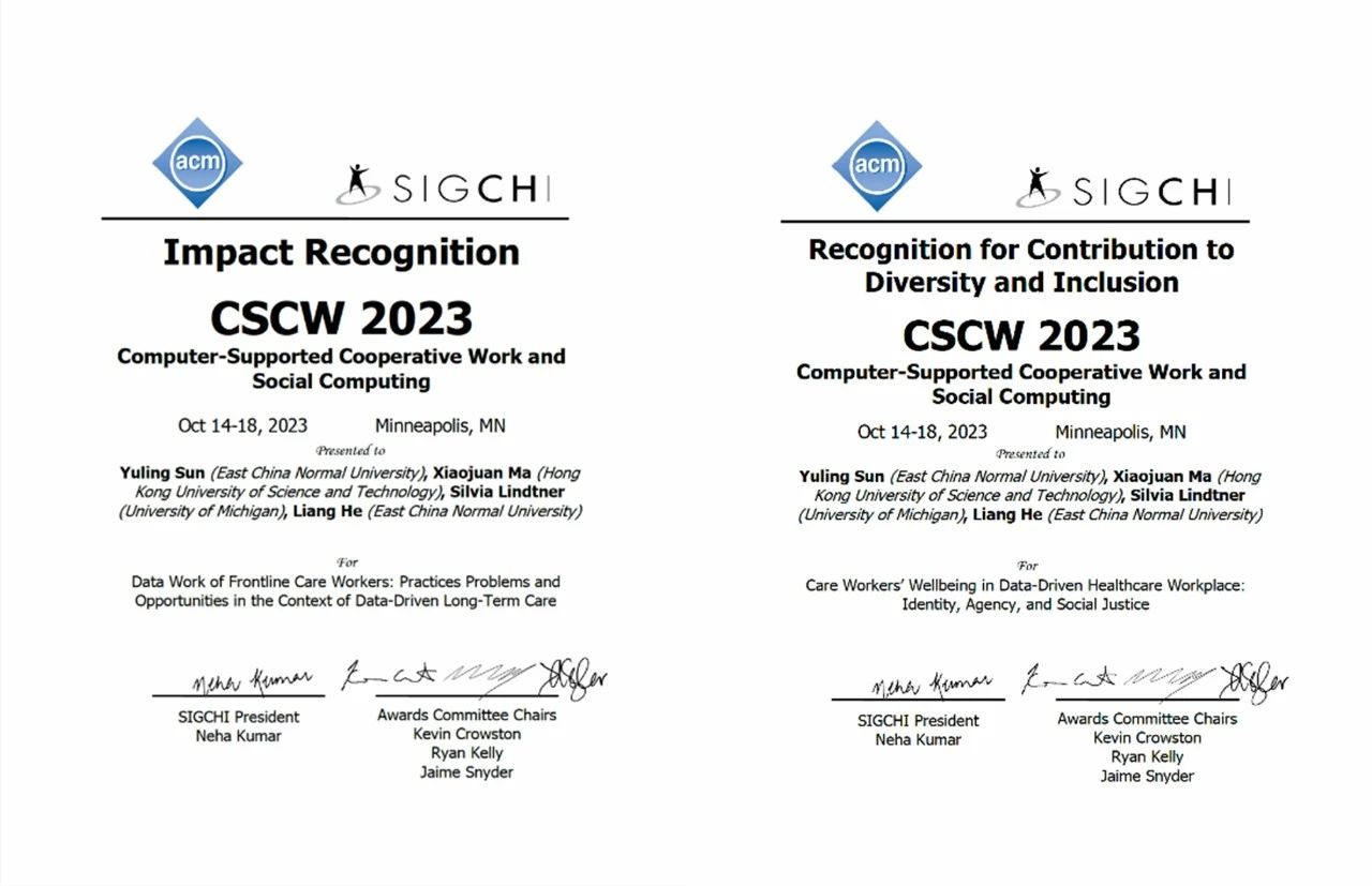 人机交互和社会计算领域顶级国际会议ACM CSCW 2023 奖项与表彰公布(https://cscw.acm.org/2023/index.php/awards/),ICALK人机交互课题组两项研究被长文录用并获得论文表彰奖。其中,Data Work of Frontline Care Workers: Practices, Problems and Opportunities in the Context of Data-Driven Long-Term Care获得影响力表彰奖/Impact Recognition Award(共5篇),Care Workers’ Wellbeing in Data-Driven Healthcare Workplace: Identity, Agency, and Social Justice获得包容性贡献表彰奖/Recognition for Contribution to Diversity and Inclusion Award(共15篇)。