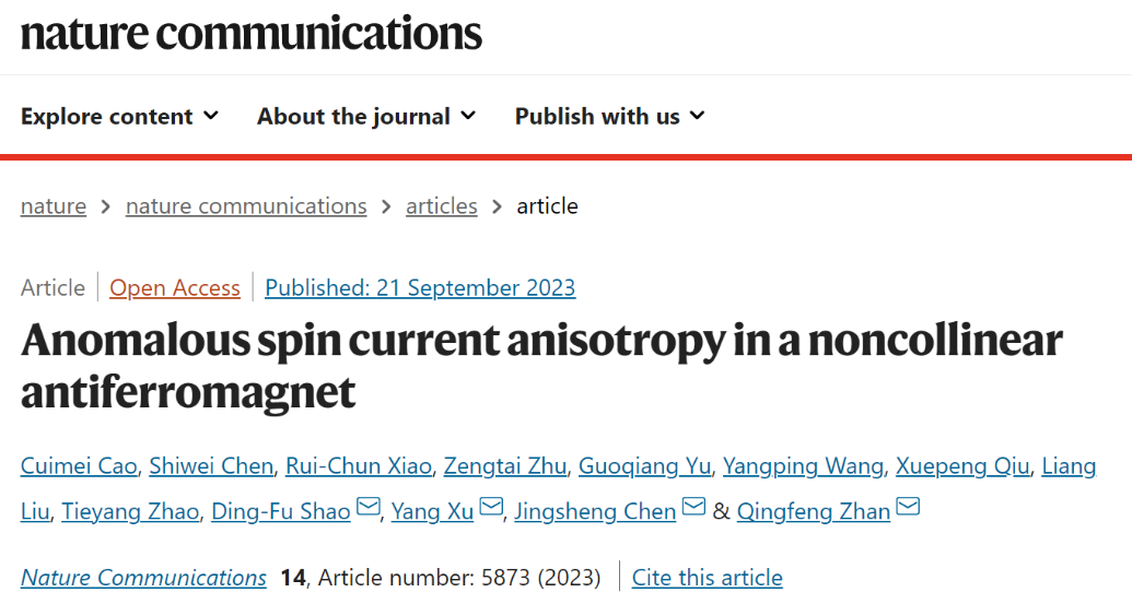 物理与电子科学学院徐杨研究员与詹清峰教授团队发现,通过时间反演奇对称与偶对称的自旋霍尔效应相结合,立方结构非共线反铁磁体Mn3Pt中可以产生各向异性的自旋流。这种新机制表明,可以通过简单地改变面内电流方向,调控不同极化方向自旋流的自旋轨道矩效率,实现高效率电流诱导磁化翻转的新型自旋电子学器件。