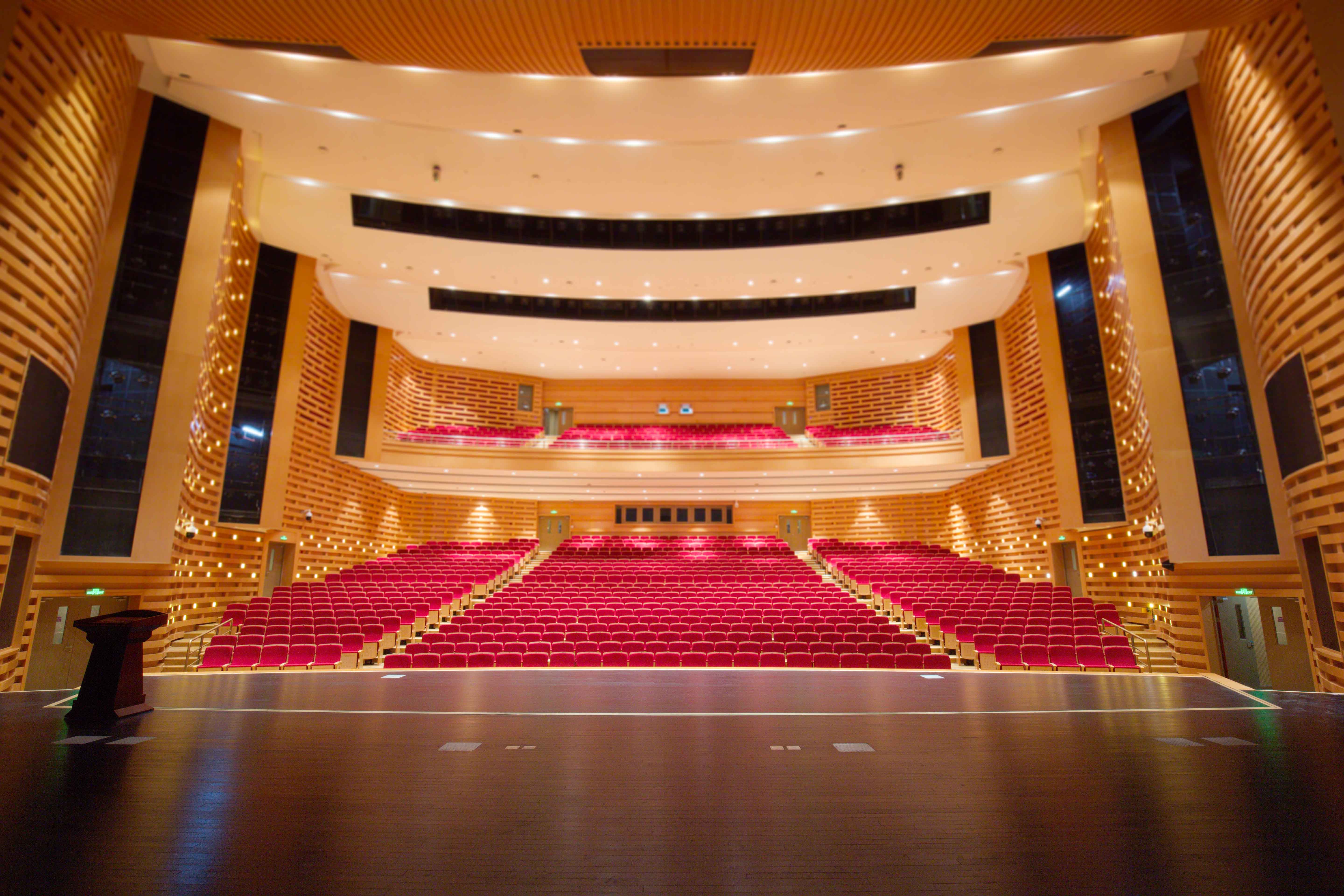 中心剧院占地7000余平方米,主舞台宽20米,深22米,高33.05米,地下舞台最深台仓区域为-14米,舞台面积约420平方米,台口外有乐池升降台。主舞台为无极升降式舞台,在平时台面上下4.5米范围内升降,灯光和布景形式灵活多变,均实现智能化操控。