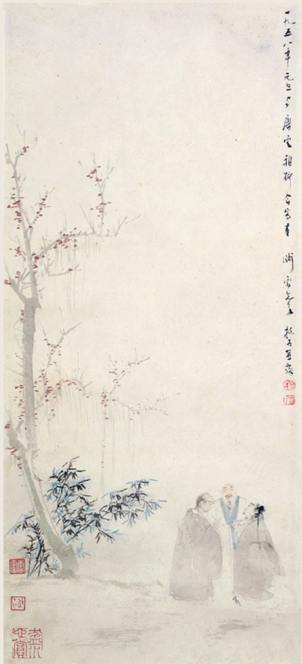1958年,苏渊雷被调往哈尔滨师范学院,临别时唐云、谢稚柳、傅抱石为苏渊雷合作《送别图》,画上有竹子、柳树及三个人物,反映了他们之间的珍贵感情,“折柳”是送别友人的常见题材,此画题款为“一九五八年,元旦与唐云、稚柳合写,奉渊雷先生,抱石并题。”从题款、题材与风格可断定人物为傅抱石所作,寥寥几笔,栩栩如生。