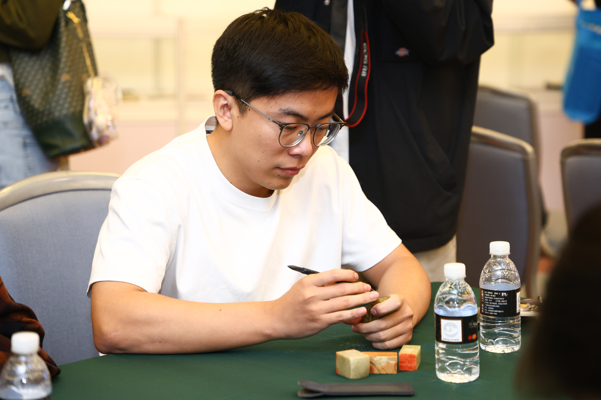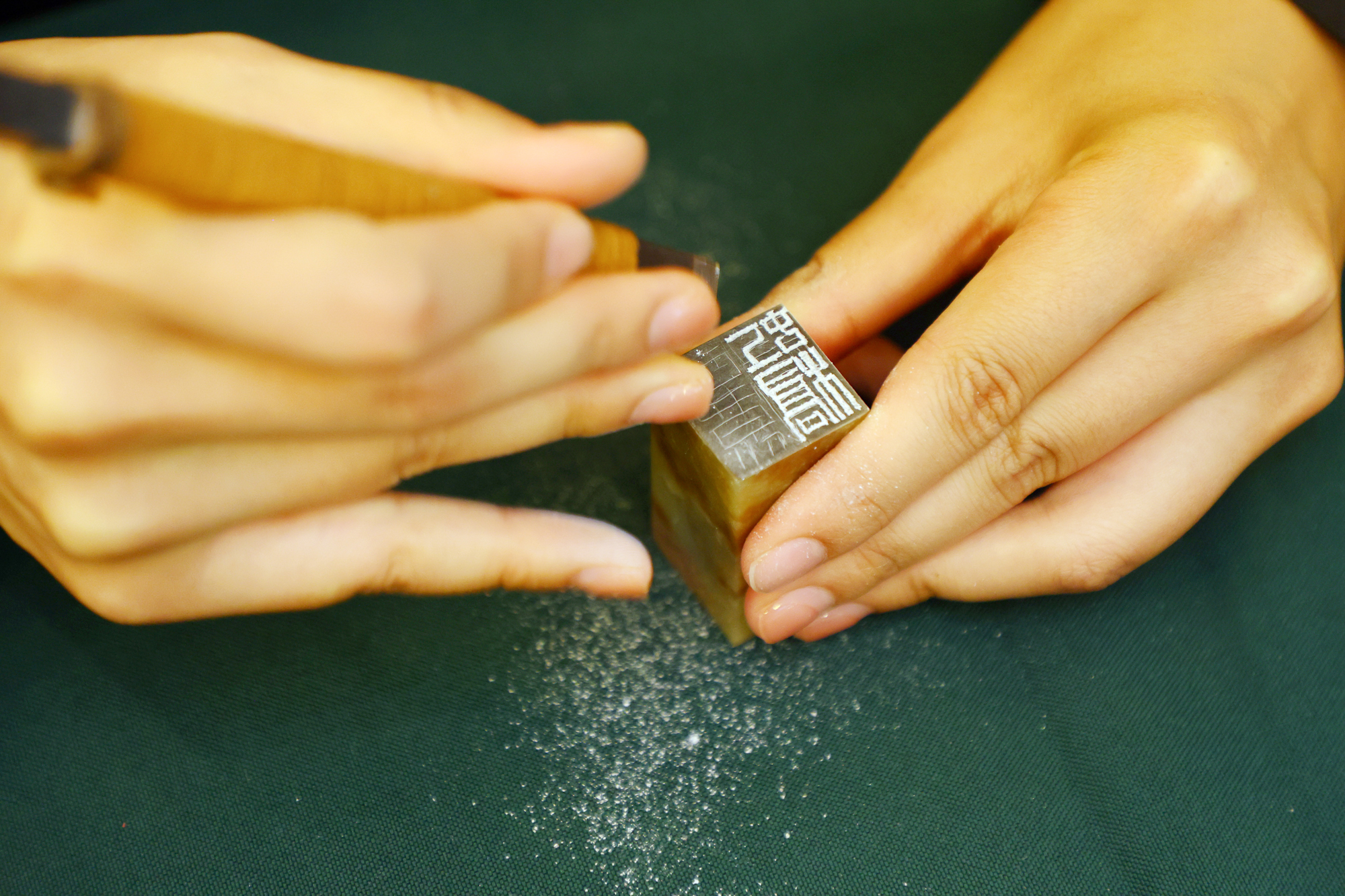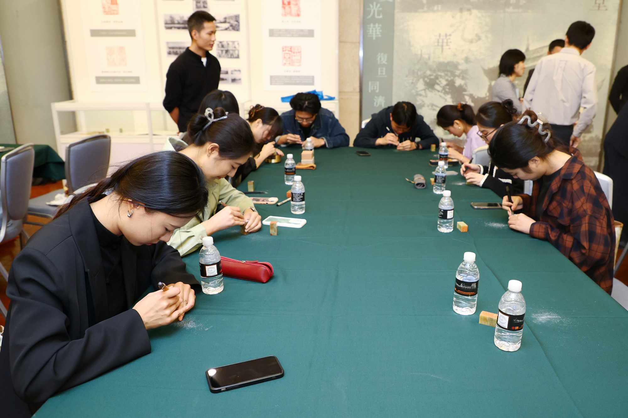 除了陈列高清放大的篆刻作品外,现场40多位同学拿起刻刀,围绕主题现场篆刻,相互切磋。据悉,“大夏百咏”是学校2022-2023年文化传承创新示范项目。书法系同学和校友将用半年时间进行创作,最终呈现《大夏百咏篆刻集》并举办展览。“大夏百咏篆刻集”已由韩天衡先生亲笔题写。