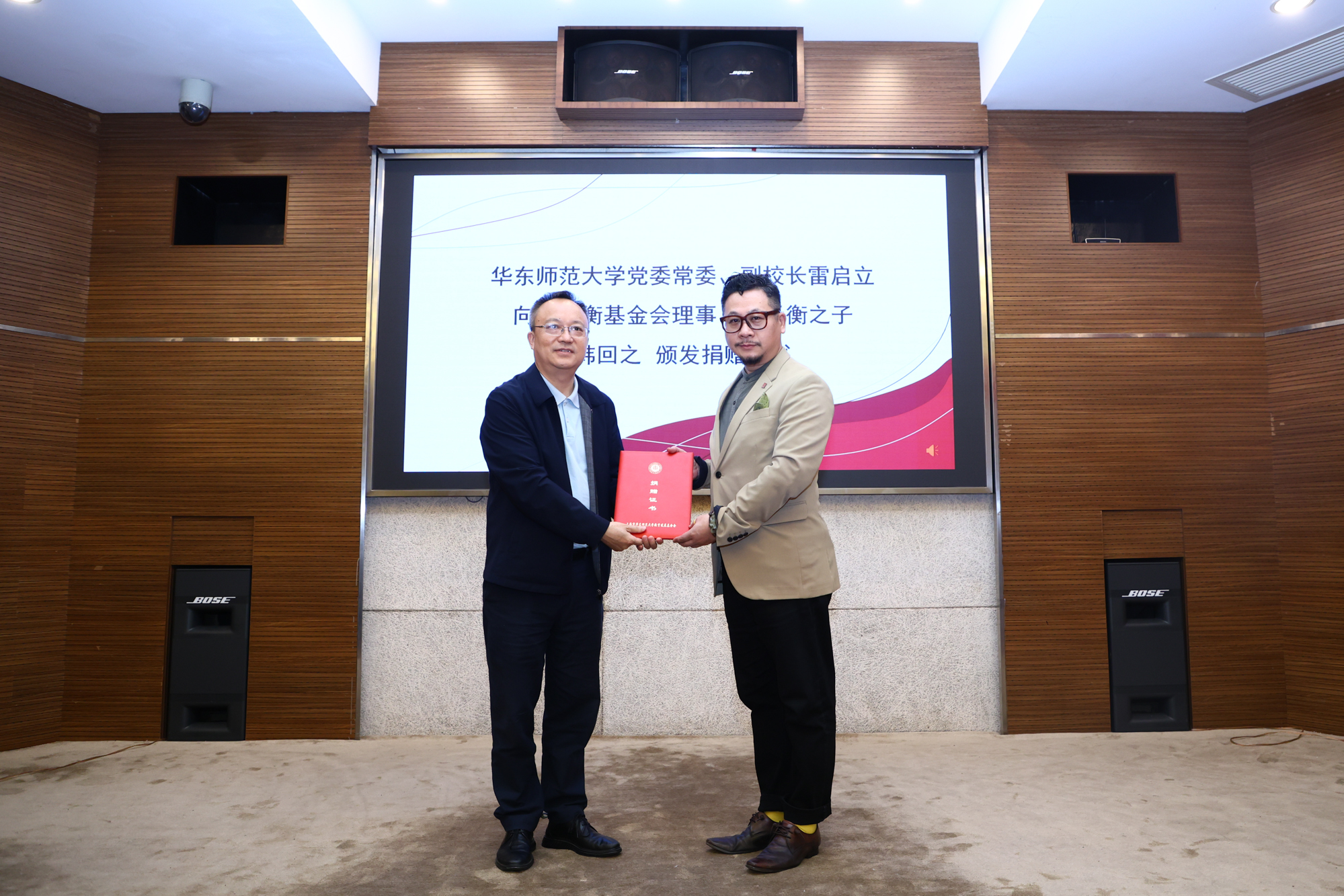 华东师大副校长雷启立为韩天衡先生之子、韩天衡文化艺术基金会理事韩回之颁发捐赠聘书
