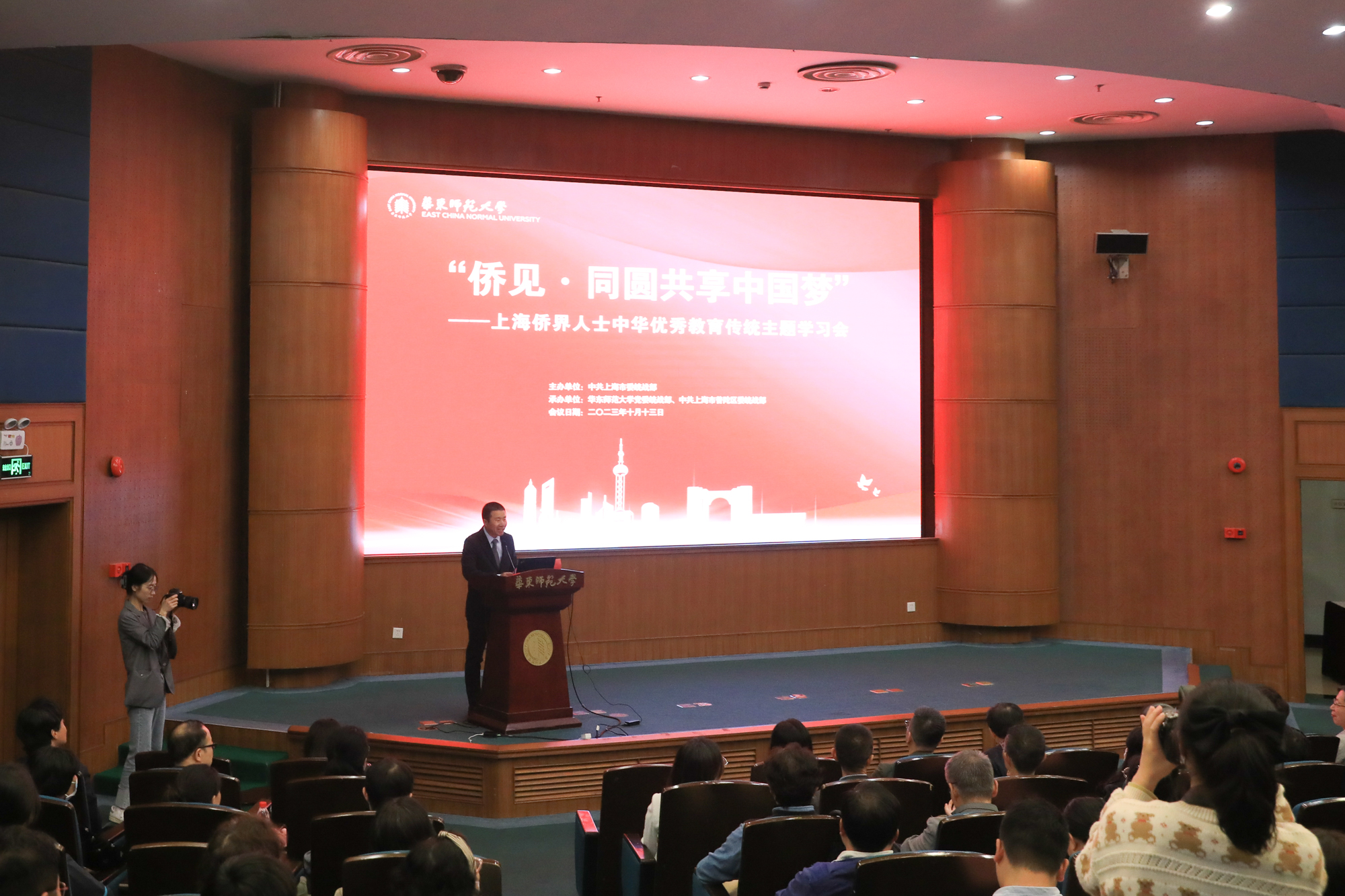 为引导侨界群众弘扬爱国报国的光荣传统,为强国建设、民族复兴汇聚磅礴力量,10月13日下午,“侨见·同圆共享中国梦”——上海侨界人士中华优秀教育传统主题学习会在华东师大逸夫楼报告厅举办。本次活动由上海市委统战部主办,华东师大党委统战部、普陀区委统战部承办。市委统战部常务副部长、市侨办主任董依雯,市政协港澳台侨委员会常务副主任张浩亮,致公党市委秘书长刘新宇,市欧美同学会副会长夏民,华东师大党委书记梅兵出席活动。挪威归侨、华东师大国际合作与交流处处长、校侨联主席杜震宇主持学习会。全市侨界代表人士约180人参加活动。