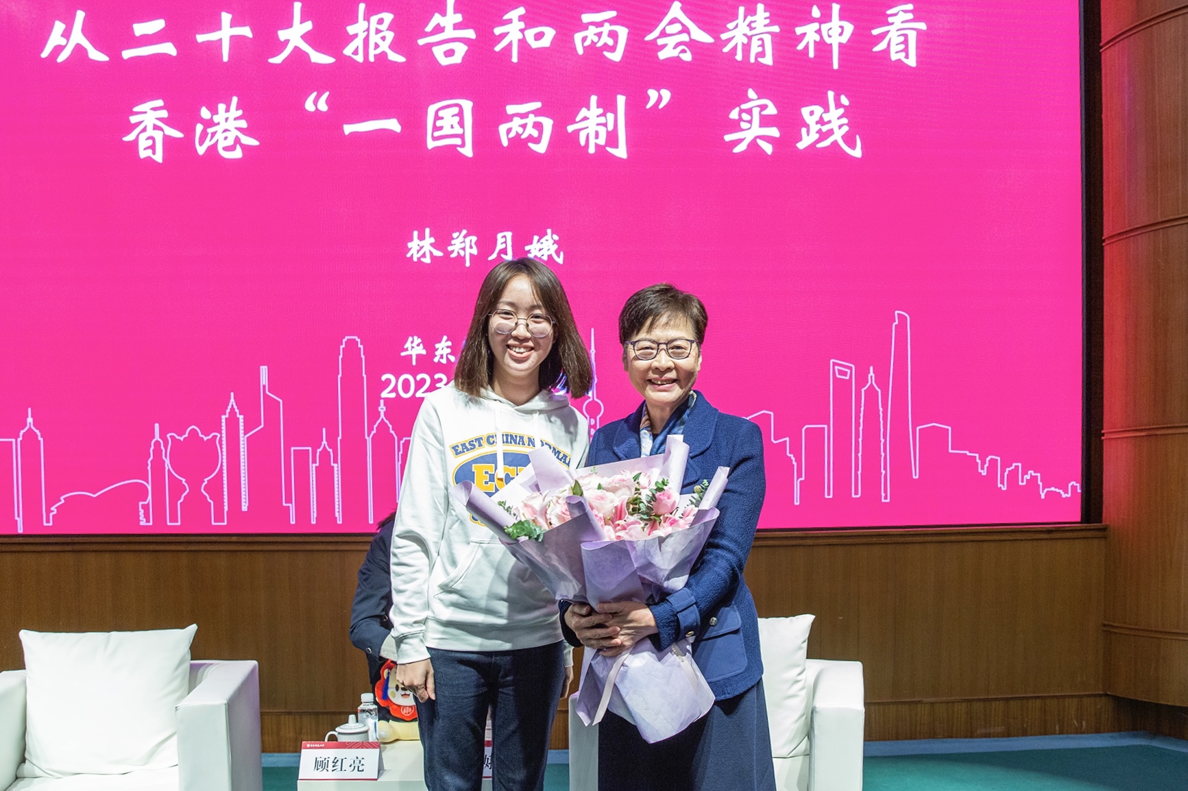 报告结束后,学生代表向林郑月娥女士赠送鲜花,对林郑月娥女士的精彩报告致以真挚的感谢。