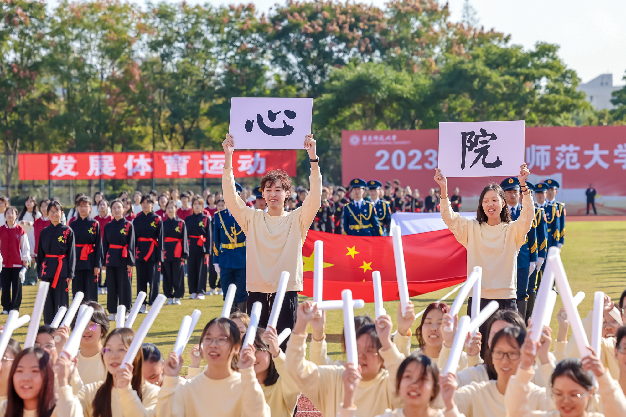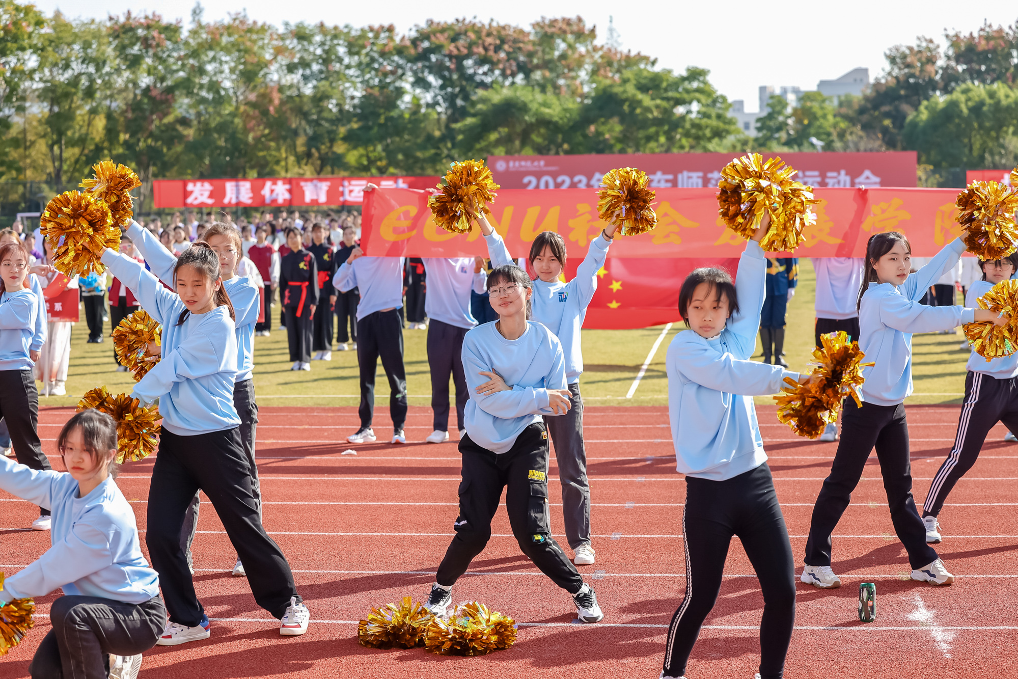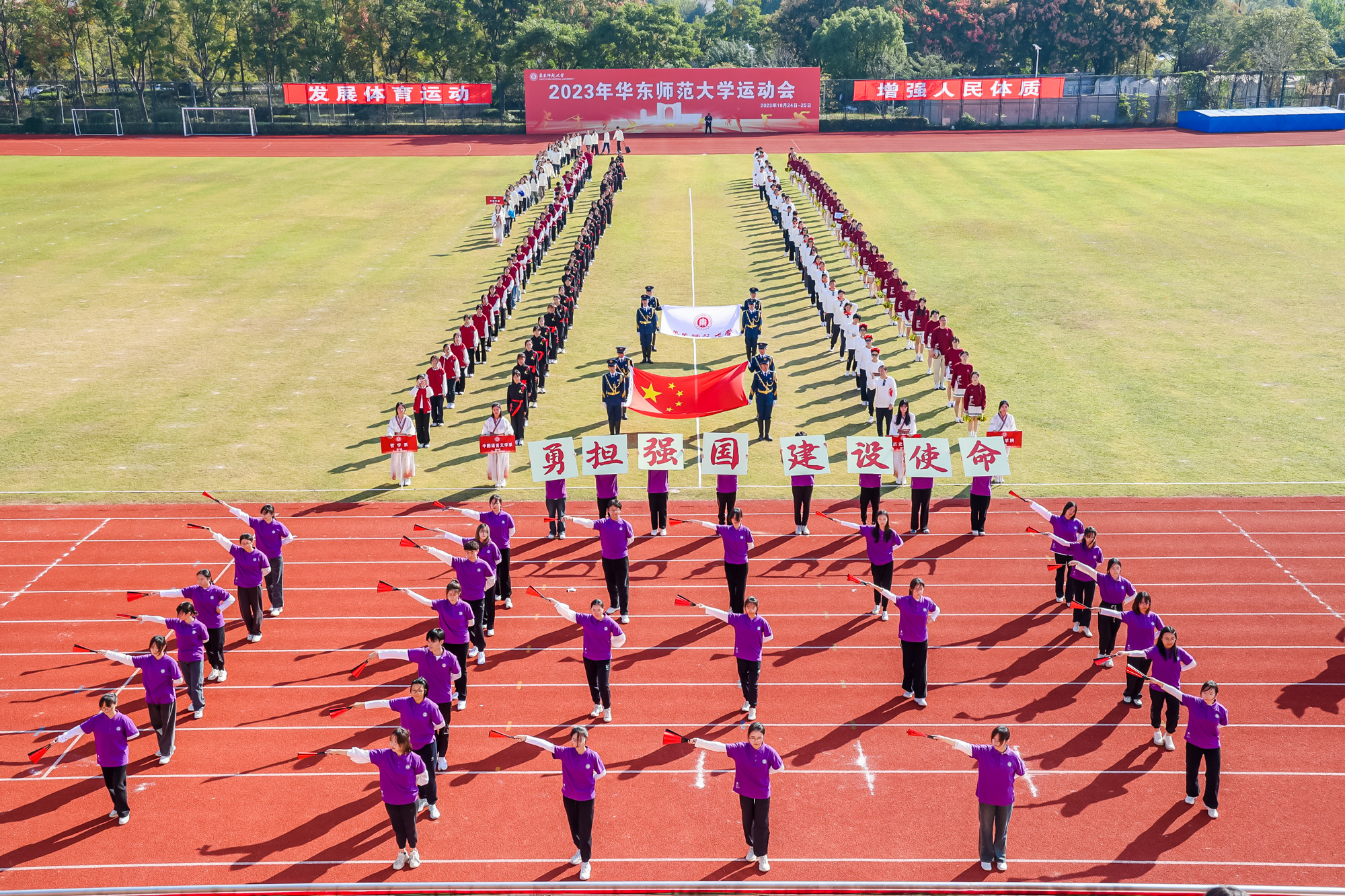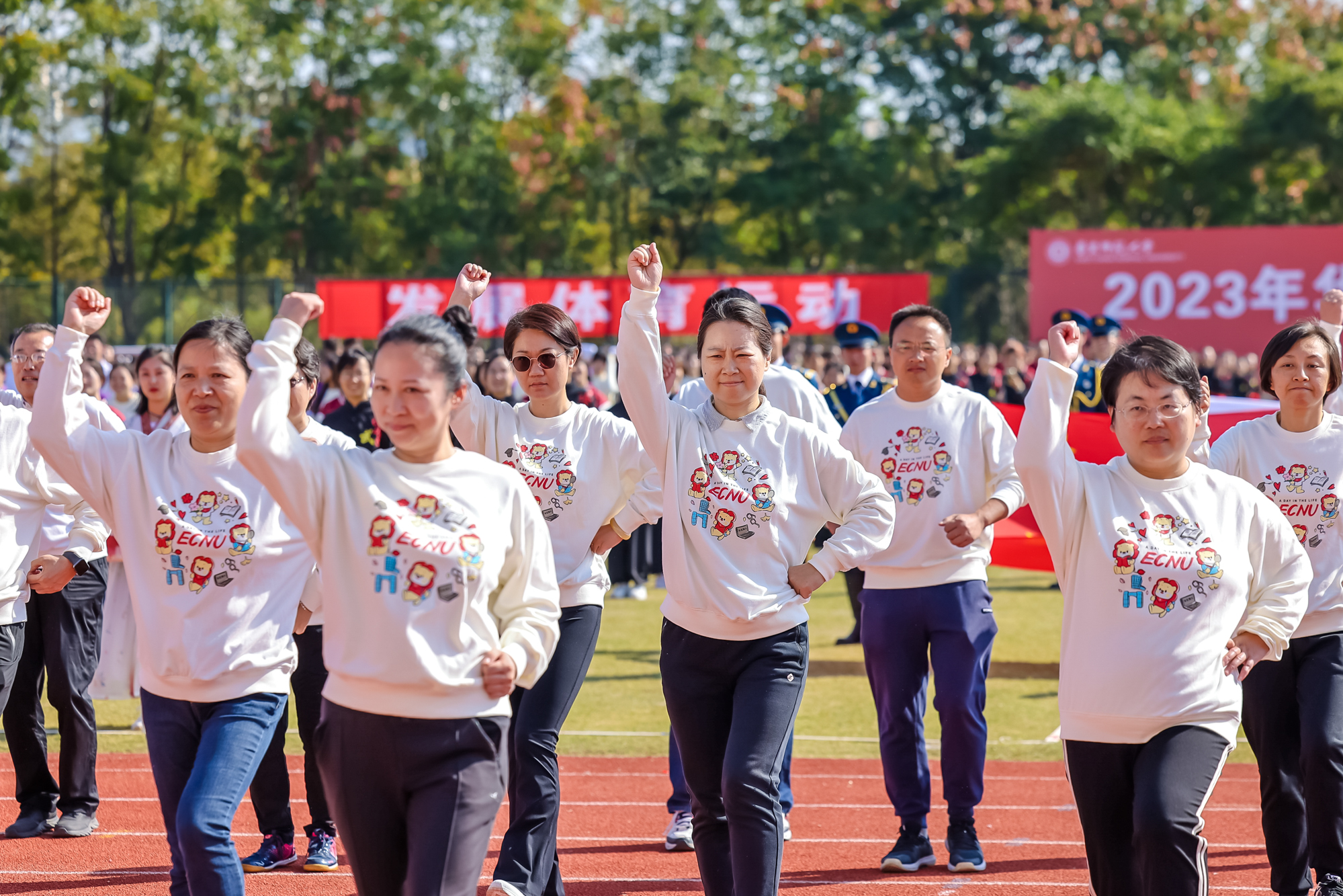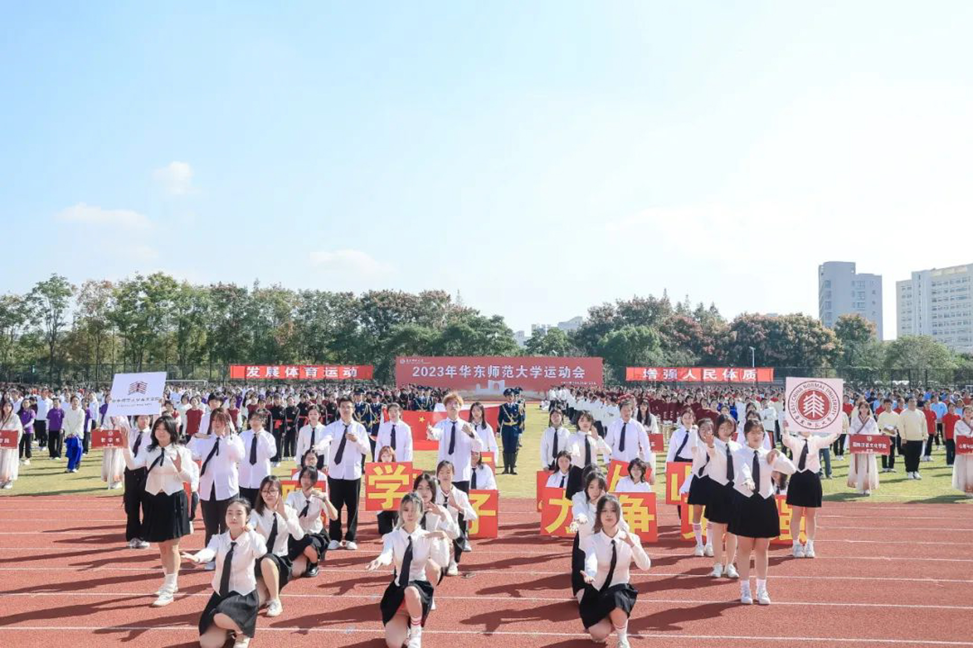 万里秋澄,惠风和畅,今日的华东师大活力四射,2023年华东师大运动会开幕式在闵行校区东区田径场举行。