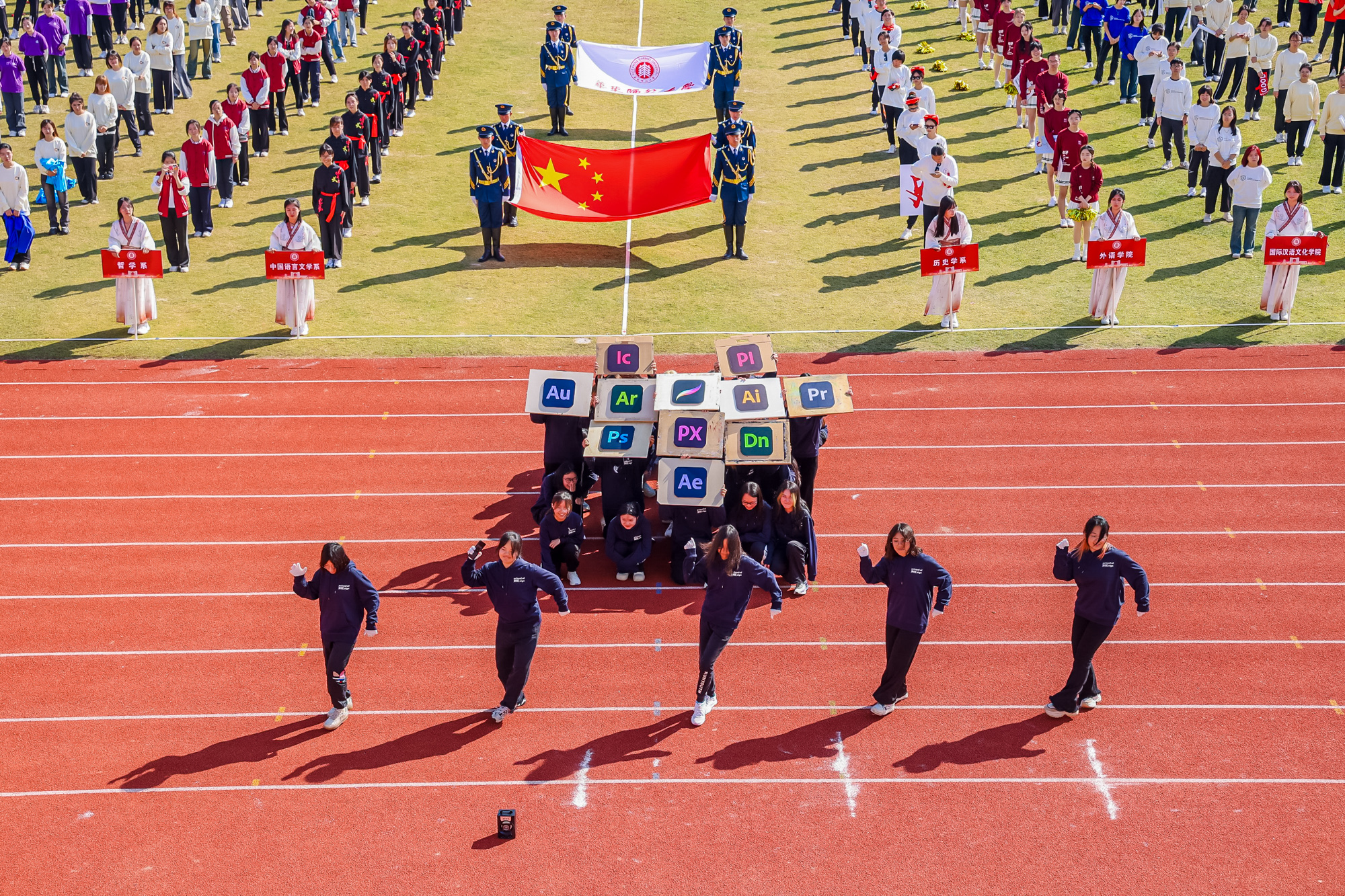 在开幕致辞中,校长钱旭红回顾了过去一年华东师大运动健儿在国内外赛场上的骄人战绩。在第25届CUBA中国大学生篮球联赛上,华东师大男篮创造队史最好成绩,首次闯入全国八强。在第31届世界大学生夏季运动会上,“眼镜侠”粟文夺得中国男子田径赛事首金。在刚刚过去的杭州亚运会中,华东师大健儿为中国代表队夺得了极为重要的3枚田径金牌。“小哪吒”葛曼棋在女子100米、女子4×100米两个项目中斩获金牌;“女飞人”林雨薇在女子100米跨栏项目中摘金。此外,健美操、啦啦操等项目在国内外赛事中也是捷报频传。