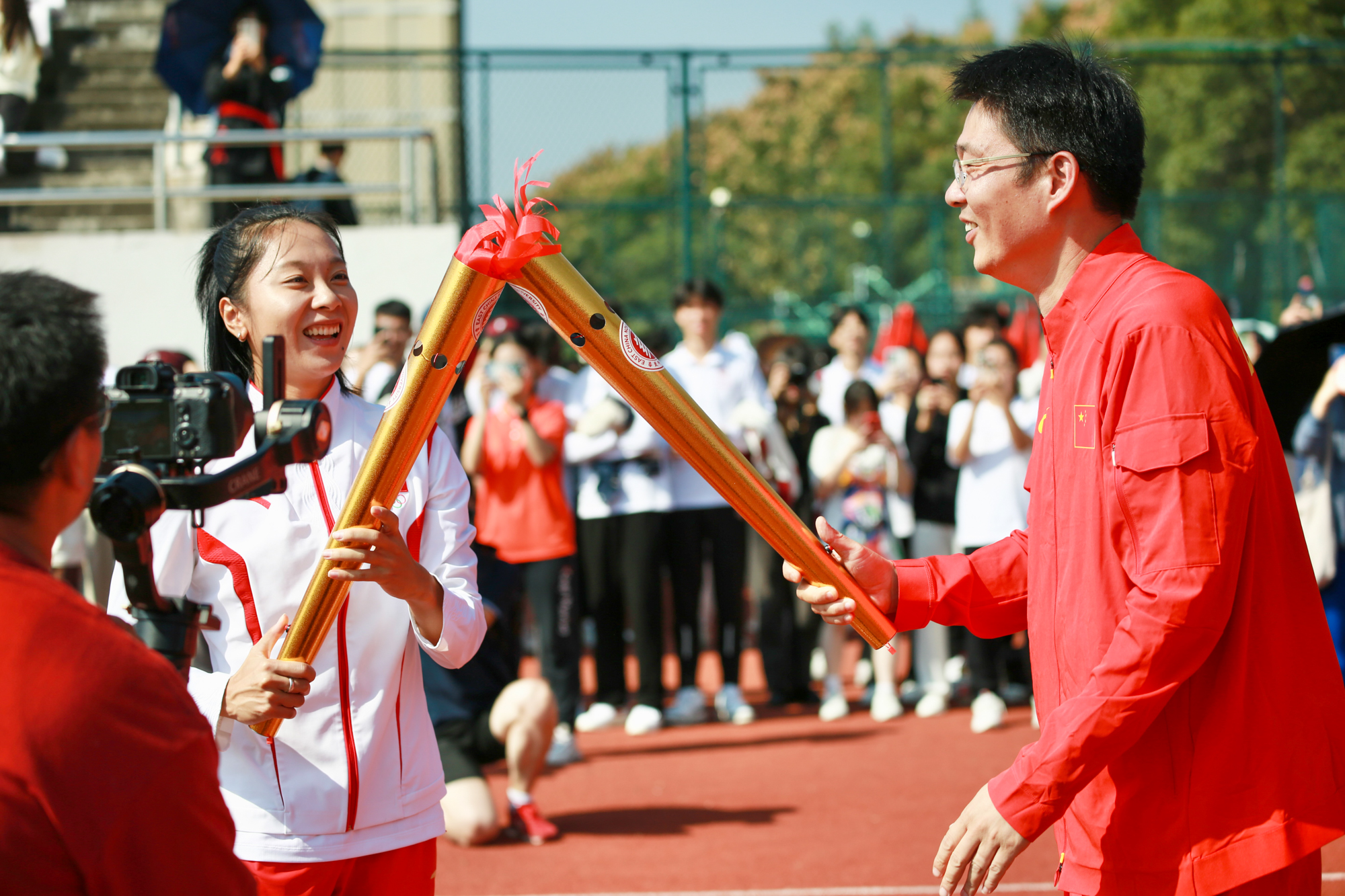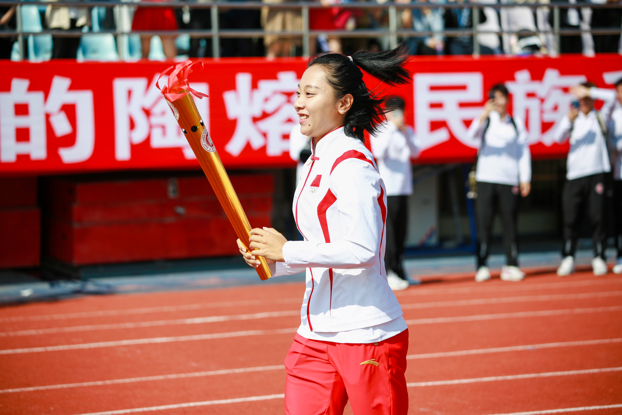 开幕式现场,第19届亚运会田径女子100米和4×100米接力冠军、澳门永利皇宫官网入口体育与健康学院2022级硕士研究生葛曼棋,女子100米栏冠军、澳门永利皇宫官网入口体育与健康学院2019级本科生林雨薇,中国国家田径队跨栏部领队、澳门永利皇宫官网入口田径队教练陈泷共同点燃主火炬。