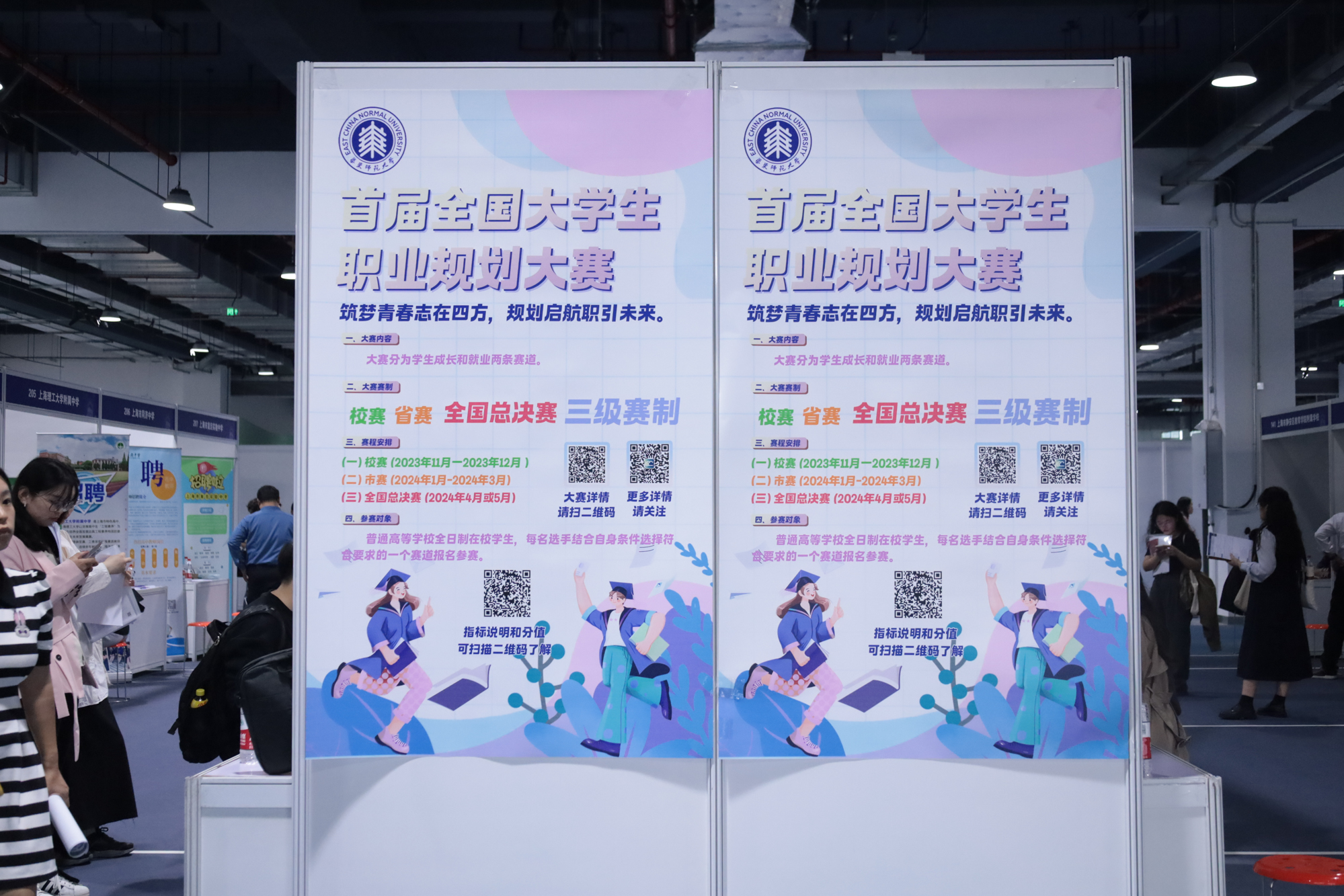 本次招聘会特别开辟专区、设立专栏宣传全国首届大学生职业生涯规划大赛。此次大赛不限专业、不限年级,面向高等学校全日制在校学生,分为成长赛道与就业赛道。大赛将采用校赛、省赛、全国总决赛三级赛制,其中,校赛预计于2023年11月举办,欢迎同学们关注华东师大学生就业公众号“ECNU学生就业”获得更多大赛信息。