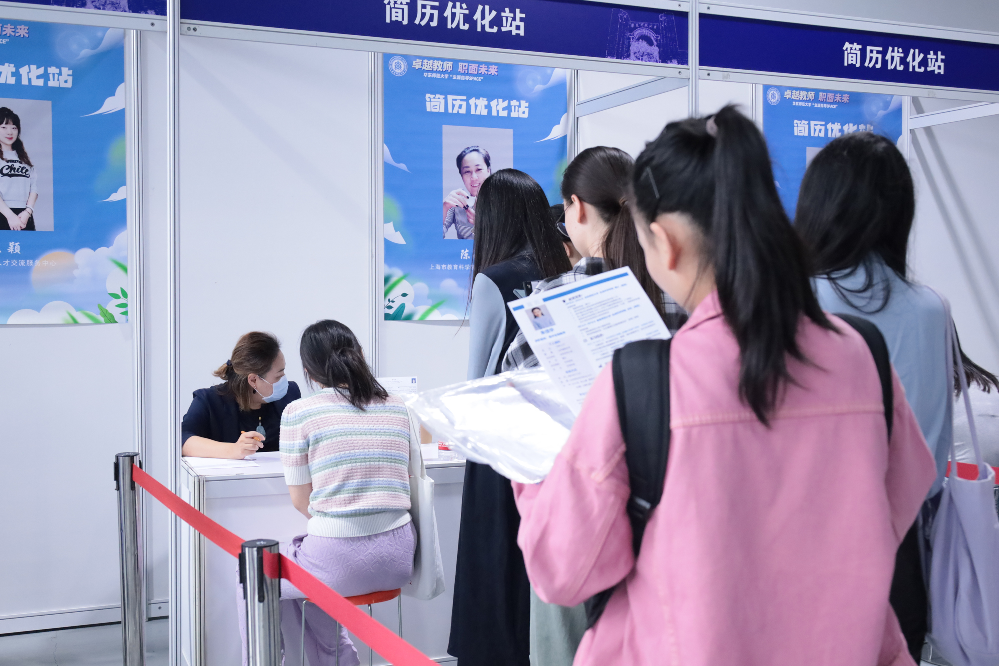 在招聘会现场,华东师大学生职业发展中心设立“卓越教师 直面未来”生涯指导专区,包含简历优化站、“妆”点魅力·赋能职场、全国大学生职业生涯规划大赛宣讲三大展位和“教育家精神”价值引领区。