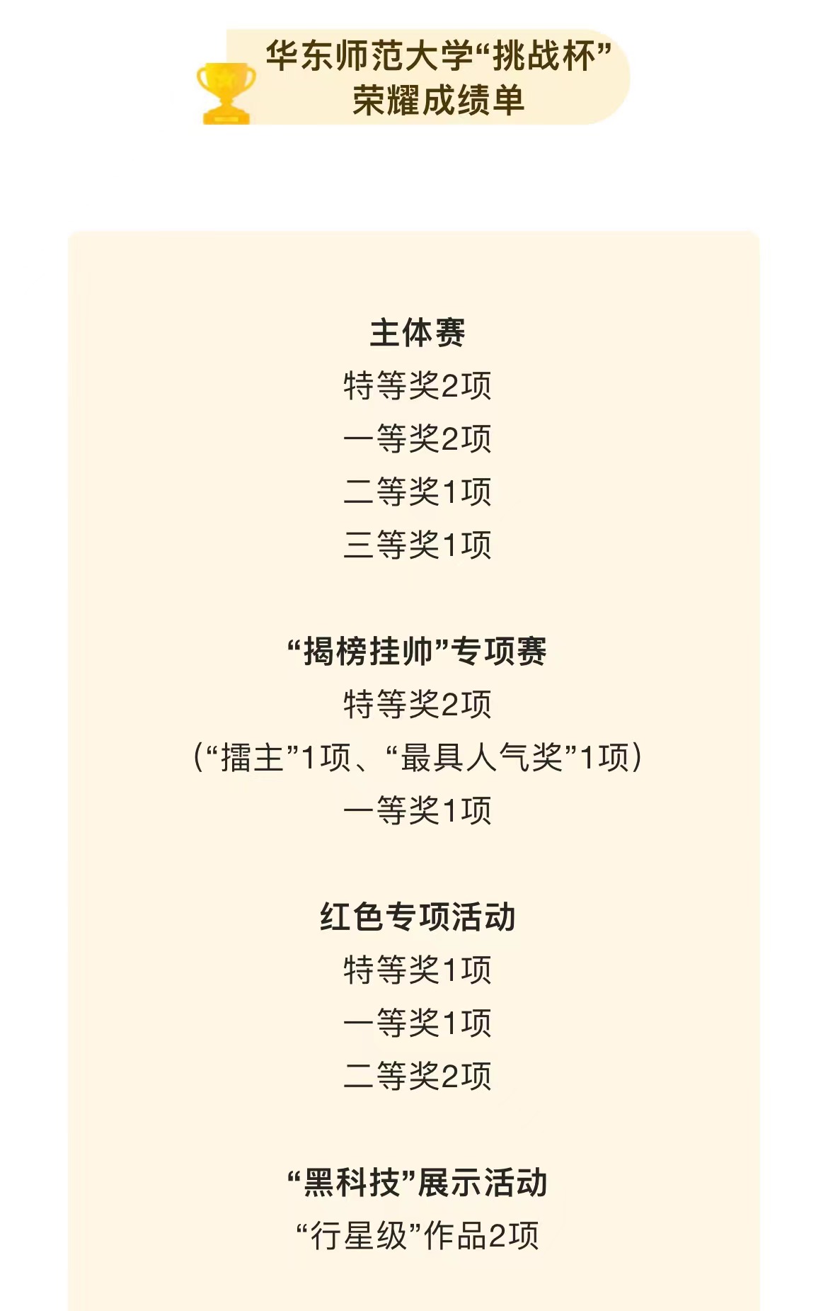 华东师大于2022年10月底启动备赛,共有2600余名学生的781个项目参与主体赛选拔,14个项目进入第十八届“挑战杯”上海市赛,以总分第一名的成绩首次问鼎上海市赛“挑战杯”。