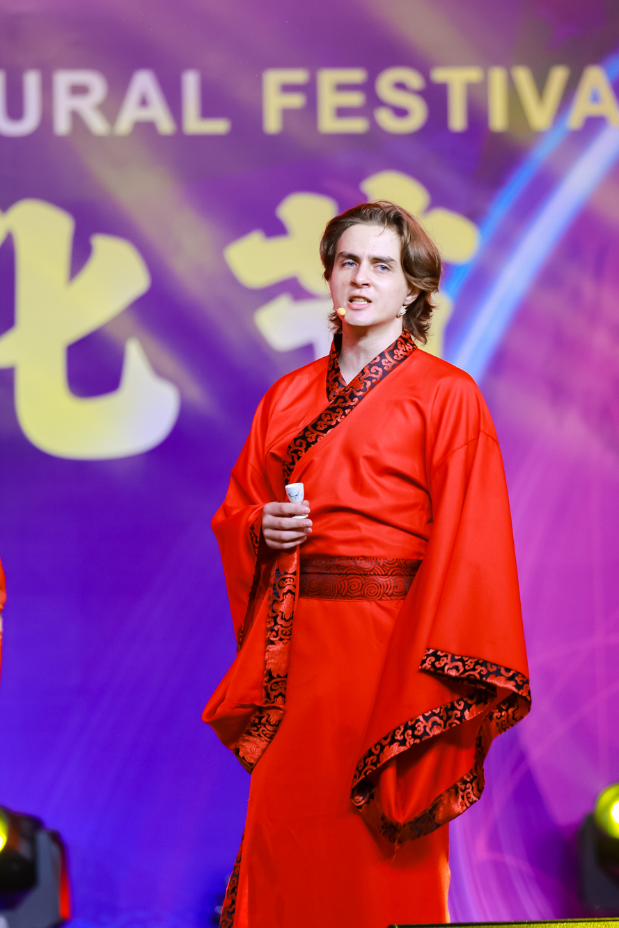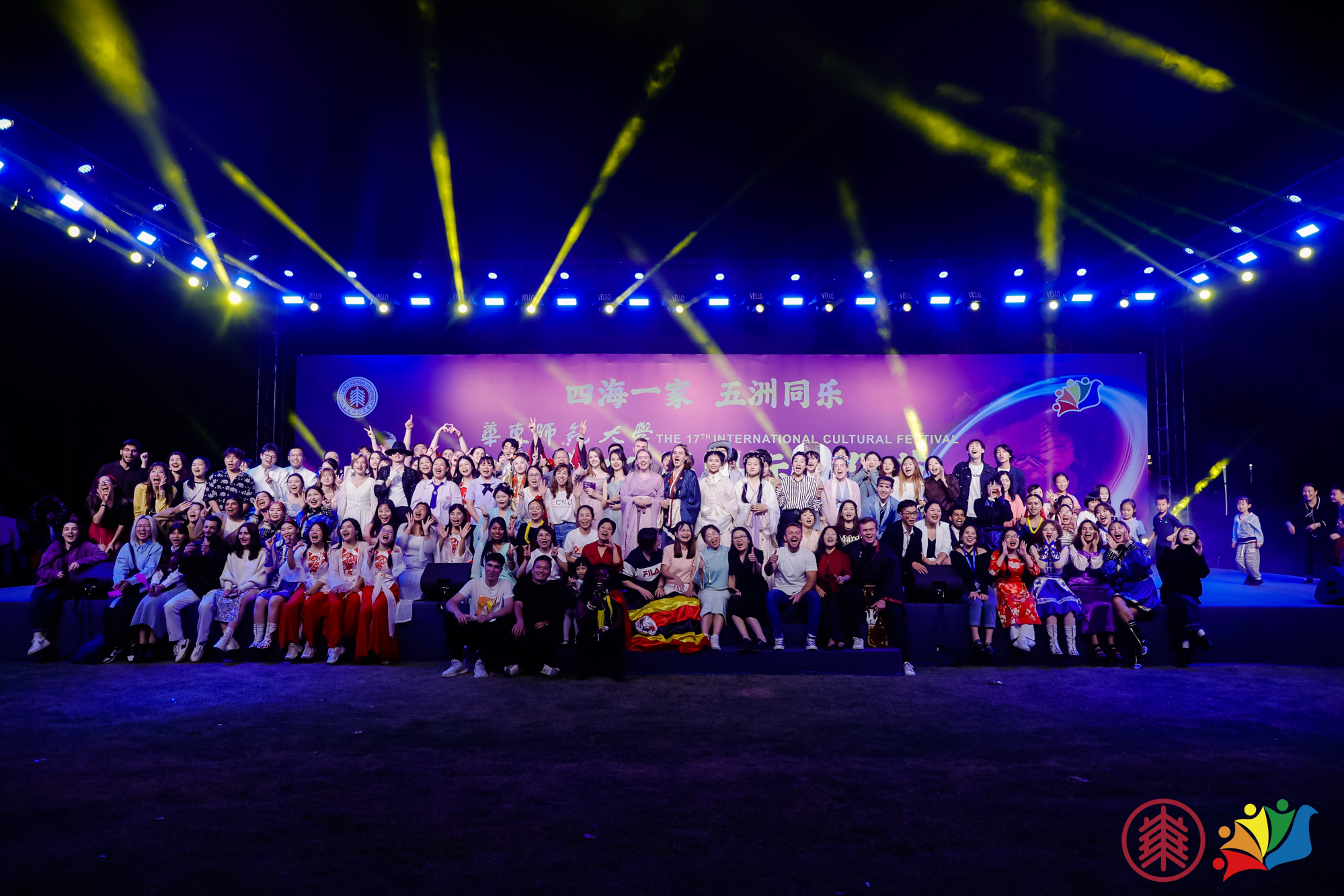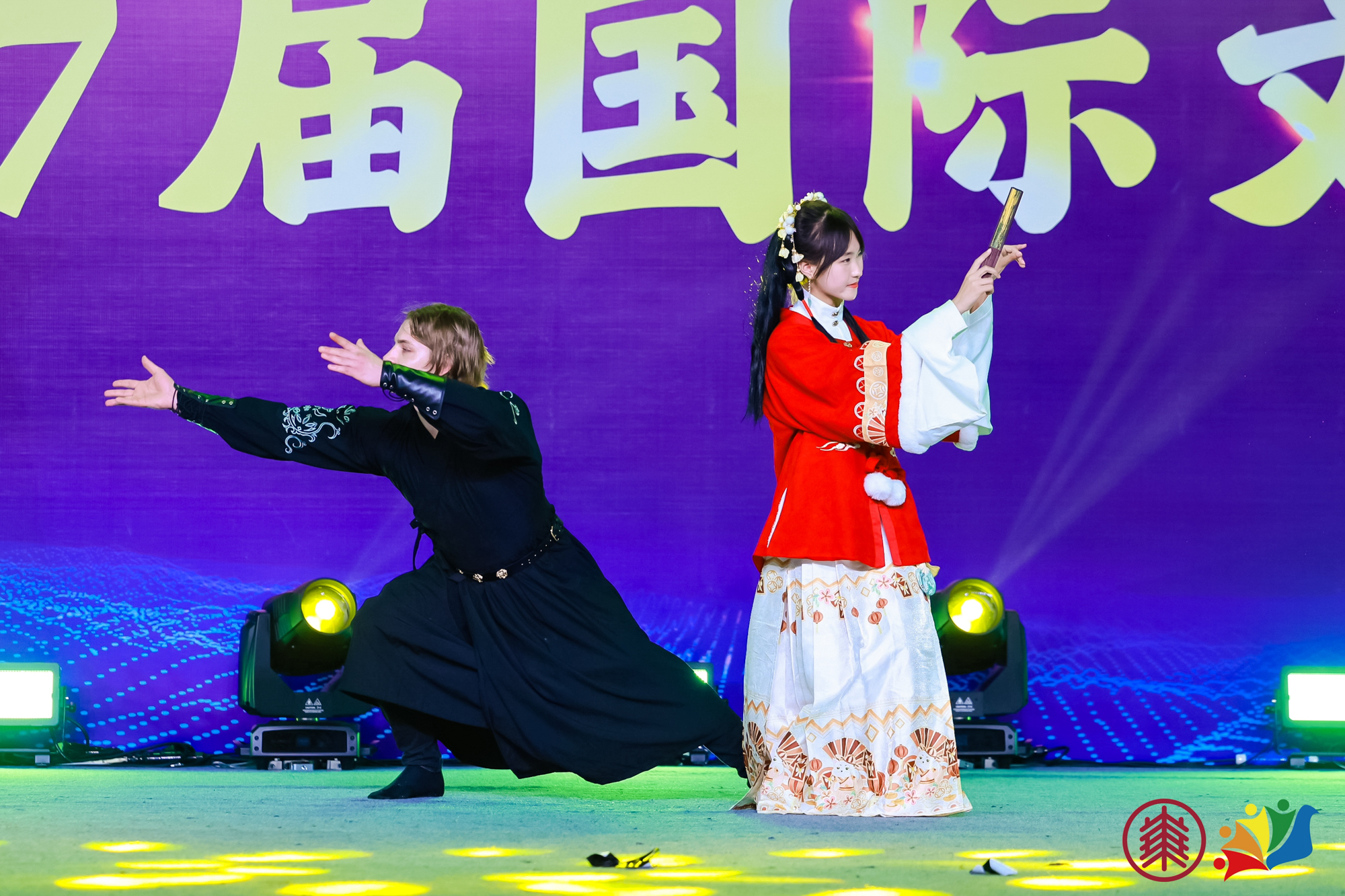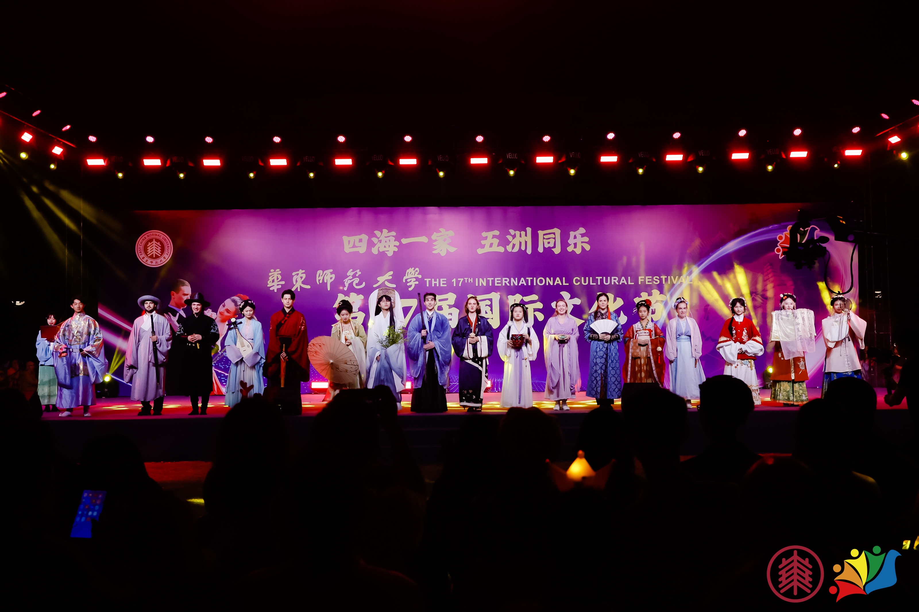 当晚,中外学生文艺汇演在万众期待下震撼开场,现场座无虚席,高潮迭起,气氛热烈。Thailand Carniwow中近三十名泰国同学生动上演泰国庙会的热闹场景,观众仿佛置身其中,流连忘返;7位分别来自挪威、美国、俄罗斯、英国、波兰、日本的留学生着一袭汉服深情吟诵《唐诗里的中国》,穿越时空再现长安盛景;来自波兰的杨佩琳同学,带来一曲Nic dwa razy,婉转清亮的嗓音唤醒沉睡的耳朵,令观众在歌声中细细品鉴了这首波兰诗人为人称道的诗作;舞蹈《真爱》由近20位越南同学倾情演绎,传统与现代,柔和与活力,红白相间的越南传统服饰,兼具魅力与力量的表演颇有一番意境;10位蒙古国同学踏着“欢快马步”,用独具民族特色的舞蹈语言展现蒙古舞独有的力与美;乌干达留学生莉迪亚演唱原创歌曲I'm in love,动感的音符,令人不禁随歌起舞;华东师大首个音乐剧团“5th 剧团”,选取了《马戏之王》的Rewrite the stars,用歌声编织了一幅高低错落的星河画卷;由洛瑛汉服社与国际学生共同演绎的汉服秀《往来千年 诗意华裳》,汉之古朴、唐之飘逸、晋之风骨、明之端庄,在中外学生的演绎下体现的淋漓尽致。晚会在华东师大国际教育中心全体老师与中外学生共同演唱《相亲相爱》的歌声中落下帷幕,“四海一家,五洲同乐”,欢笑同频,心跳共振!
