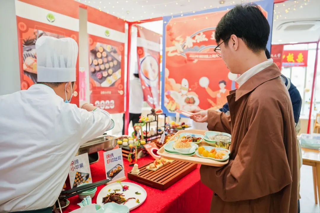 本届美食节内场吸引了本市40余家学校和相关单位汇聚成“高校美食市集”。大厨们以精湛的厨艺带来了融合经典传承与特色创意的118道美食。菜品琳琅满目、香气四溢,现场师生络绎不绝、摩肩接踵。