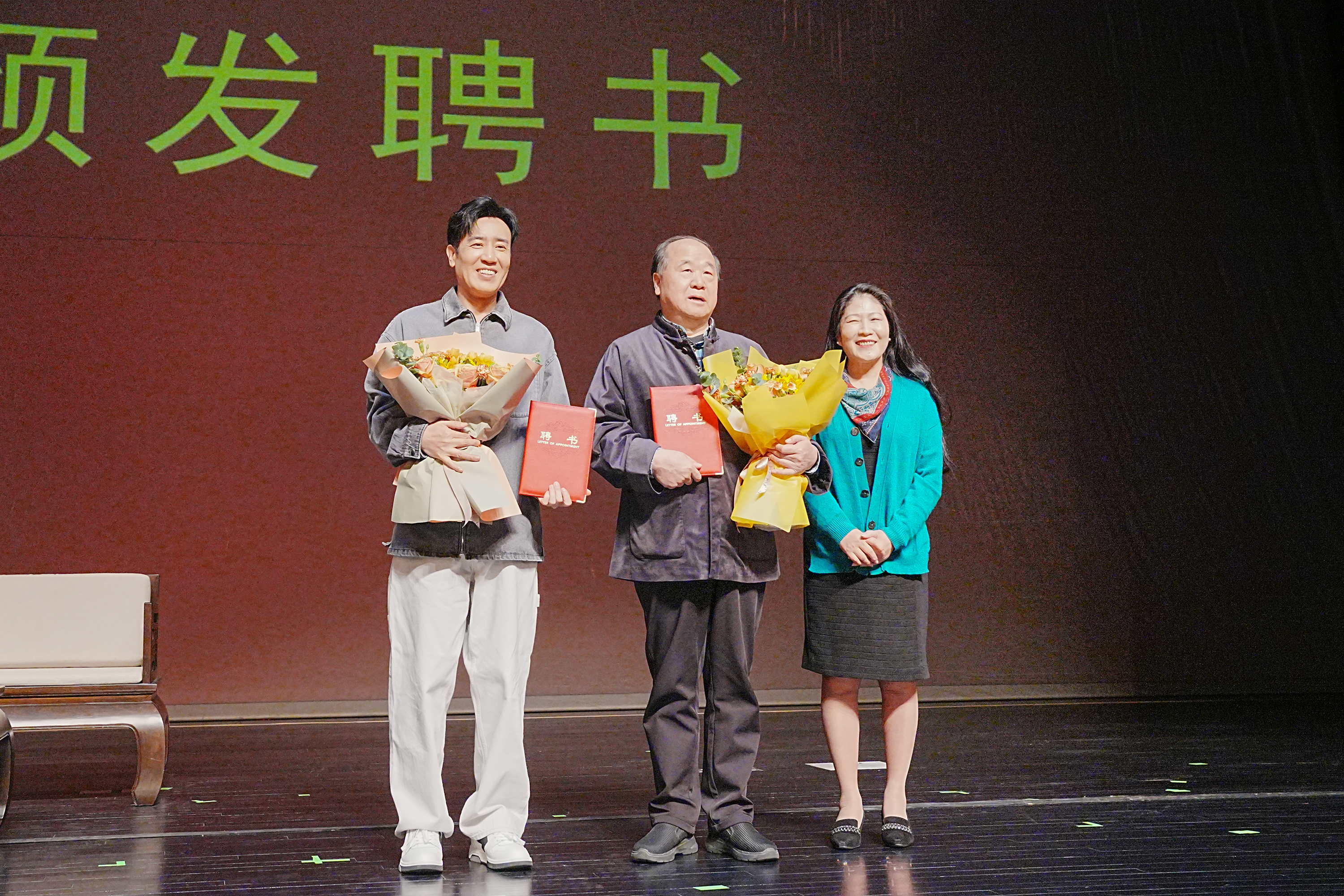 国际汉语文化学院党委书记黄美旭为莫言、于和伟颁发远读批评中心荣誉作家和荣誉艺术家聘书