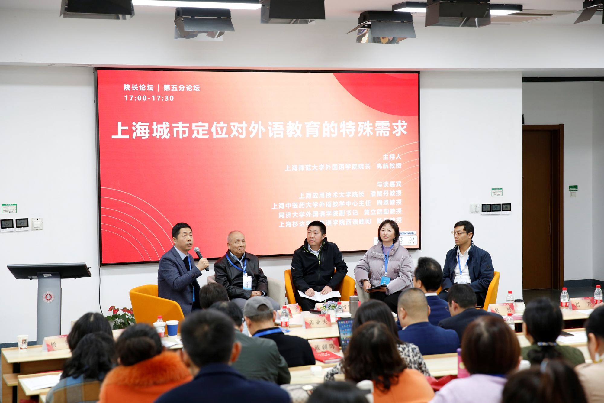 第五分论坛以“上海城市定位对外语教育的特殊需求”为主题,由上海师范大学外国语学院院长高航教授主持,与谈嘉宾有上海应用技术大学外国语学院院长潘智丹教授、上海中医药大学外语教学中心主任周恩教授、同济大学外国语学院副书记黄立鹤副教授与上海杉达学院外语学院西语顾问陈泉教授。专家们指出,外语人才培养必须紧跟国家发展:要以“专”“精”“特”“新”标准培养终身学习型人才,同时各校应在“数智时代”发掘发展自身优势领域。