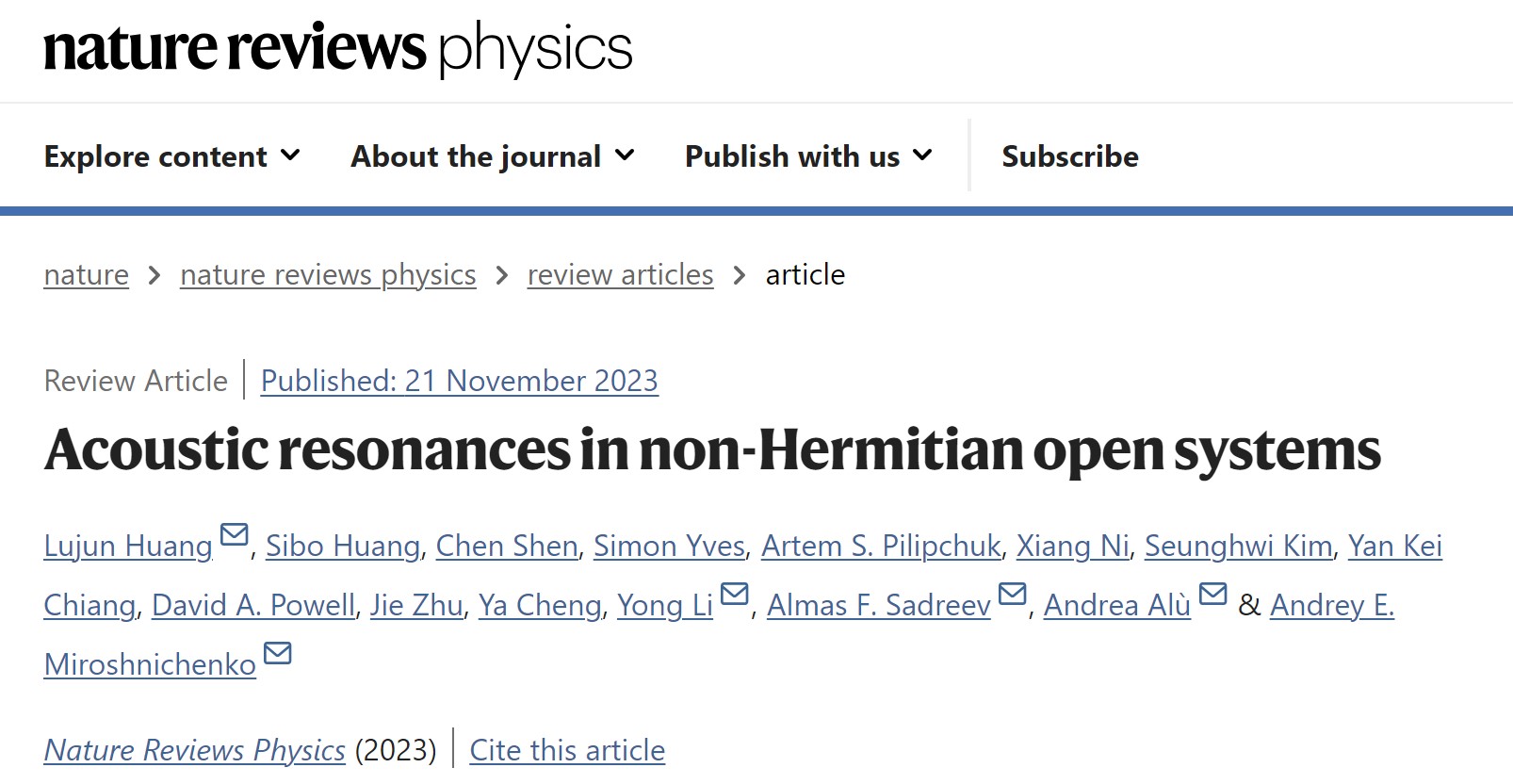澳门永利皇宫官网入口物理与电子科学学院黄陆军研究员和合作者近期以“Acoustic resonances in non-Hermitian open systems”为题在Nature Reviews Physics上发表综述文章。该论文系统性地回顾了过去几十年非厄米开放系统的声学共振领域的研究进展,并对该领域未来可能的发展方向以及面临的挑战进行了开放性的讨论。