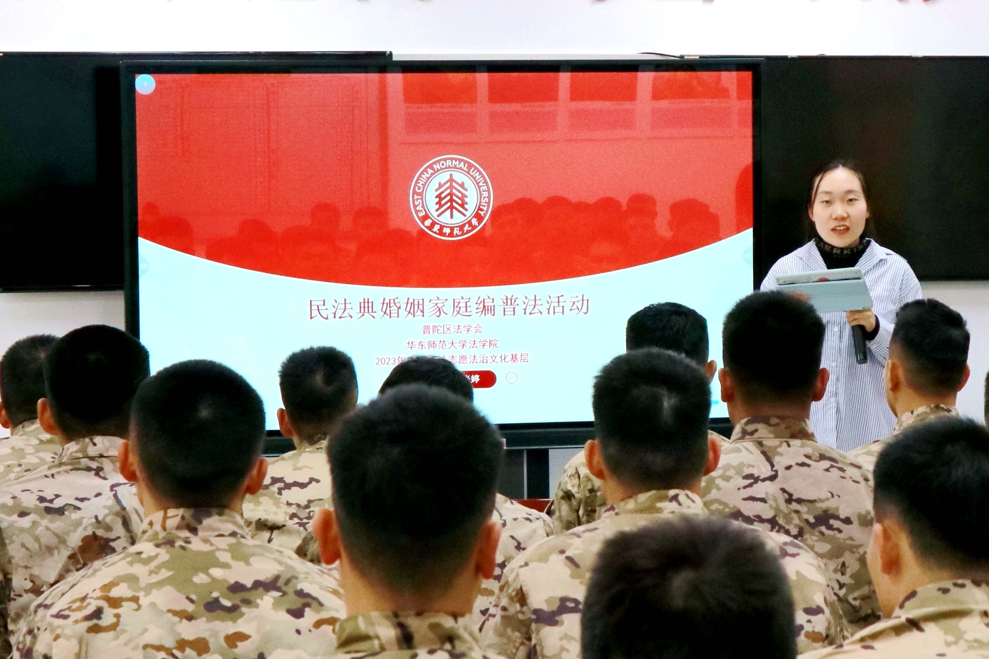 11月30日,法学院学生志愿者一行前往驻沪某部队进行普法宣讲,结合实际案例,以生动活泼的方式普及有关《民法典》《刑法》以及《治安管理处罚法》等法律法规,提高广大部队官兵尊法、守法、学法、用法的意识和能力。