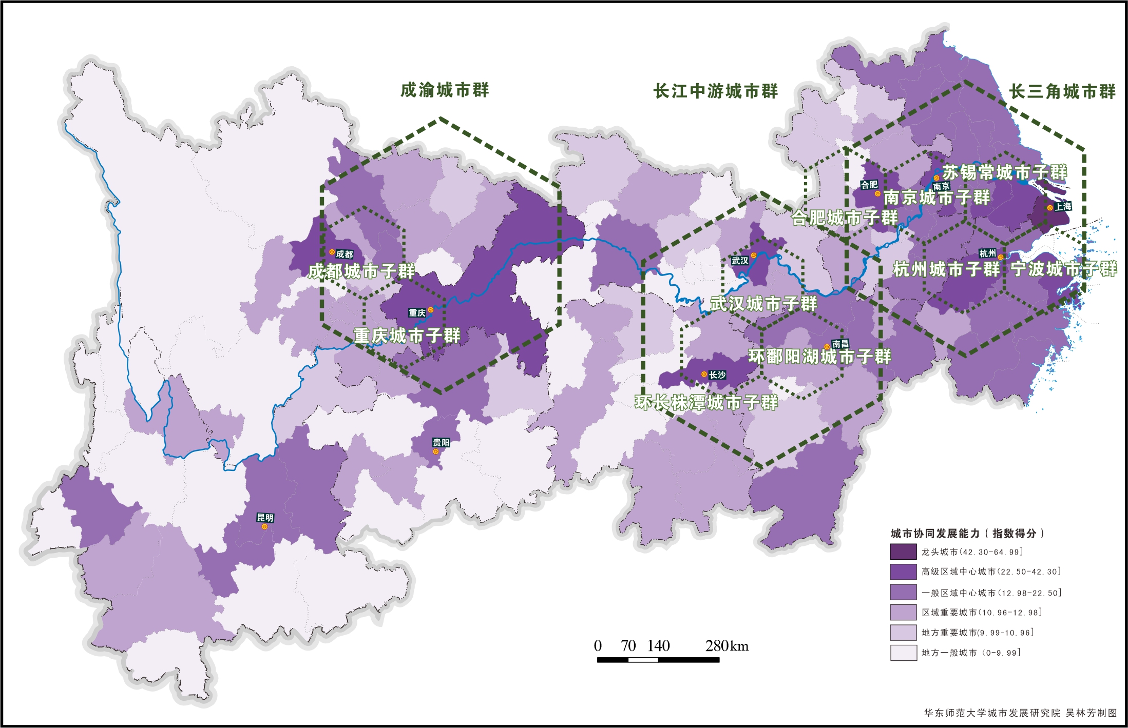 长江经济带城市协同发展能力指数(2023)表明,110座地级及以上城市呈现出6等级橄榄型结构特征:上海是龙头城市,协同发展能力在长江经济带排名首位;