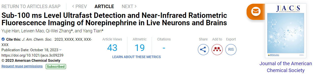 该成果以Sub-100 ms Level Ultrafast Detection and Near-Infrared Ratiometric Fluorescence Imaging of Norepinephrine in Live Neurons and Brains为题,发表在Journal of the American Chemical Society杂志,博士生韩玉界为论文第一作者,张琪伟教授和田阳教授为论文共同通讯作者。