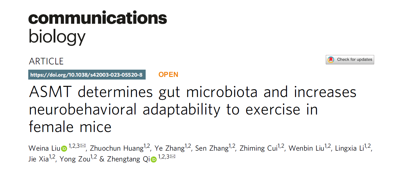 体育与健康学院刘微娜研究组最近发现,ASMT移码突变(删除外显子2的20bp)导致雌性C57BL/6J小鼠抑郁行为,且对运动的神经行为反应降低,表现为运动不能显著改善突变小鼠的抑郁行为和肠道菌群结构。该研究提示:ASMT在C57BL/6J小鼠中先天自然突变导致褪黑素合成障碍,但依然通过肠道菌群影响神经行为的适应性。女性抑郁症患者从运动中获得益处可能比男性更难。