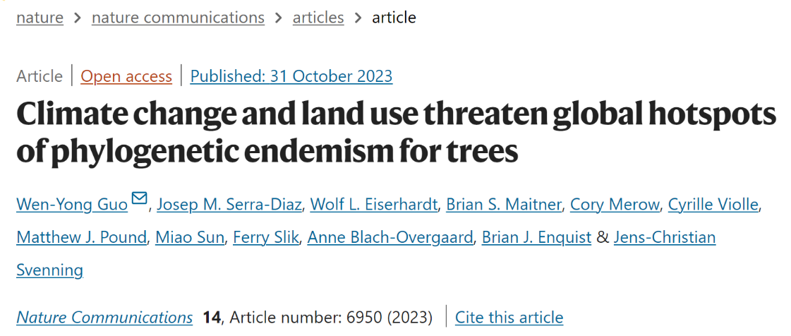 相关成果在线发表在Nature Communications期刊上,该论文是郭文永研究员团队2022年PNAS研究工作的延续,为全球树种多样性保护提供理论基础。
