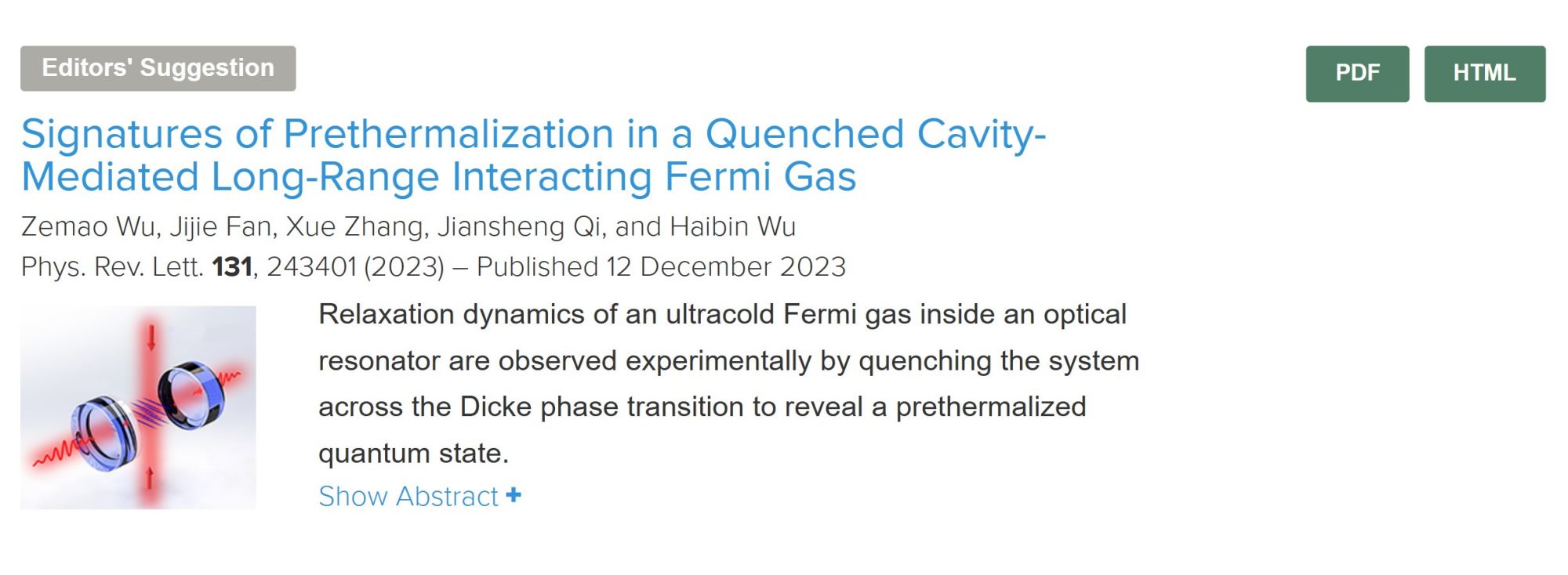 澳门永利皇宫官网入口精密光谱科学与技术国家重点实验室、量子科学与精密测量研究院武海斌教授的研究团队在腔内光子诱导长程相互作用的费米原子体系中观测到了系统越过量子相变的准热化行为,研究了领域内长期的争议问题:准稳态寿命的原子标度率问题。该研究成果于2023年12月12日以 "Signatures of Prethermalization in a Quenched Cavity-Mediated Long-Range Interacting Fermi Gas" 为题发表在《物理评论快报》(Physical Review Letters),并被编辑推荐为突出亮点工作,澳门永利皇宫官网入口为论文第一完成单位,博士研究生武泽茂为该工作第一作者,武海斌教授为论文的通讯作者。