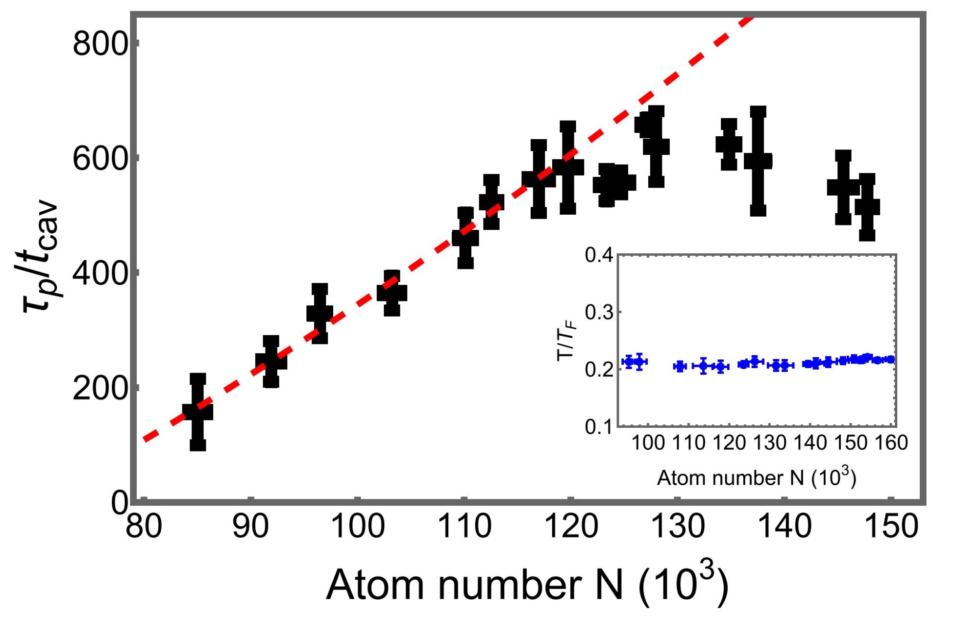 在长程相互作用多原子系统中,系统处于准静态的寿命将随着系统尺寸的增加而增加,并且与原子数存在着一定的标度率,平均场理论模拟给出τp∝ N1.7的标度关系。对于玻色爱因斯坦凝聚(BEC)与CQED相耦合的系统,相应的理论数值计算并没有发现这一规律。实验上,在超冷费米气体与CQED相耦合的系统,研究了准静态寿命τp对原子数N的依赖关系,如图3所示数据表明两者的依赖关系满足τp∝ N1.53。