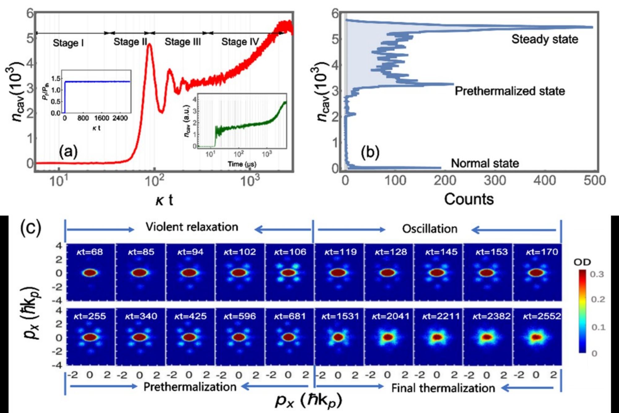 图1(a)和图1(b)分别为实验装置示意图和实验采用的淬火方案。一个频率小于费米原子共振频率的激光在横向泵浦光学腔内的超冷费米原子,突然增加泵浦光的功率跃过相变点,驱离系统远离平衡态,通过无损探测内腔光场和原子的动量分布可以研究系统的动力学演化行为。如图2(a)所示,可以看出系统表现出了非常复杂的热化动力学行为,系统的非平衡动力学演化表现出延迟,快速弛豫,长寿命的准静态以及最终的缓慢热化四个阶段。在该演化过程中,系统将经历三个不同的态,如图2(b)所示,自下而上,三个峰分别代表系统处于正常态,预热态和最终的稳态。