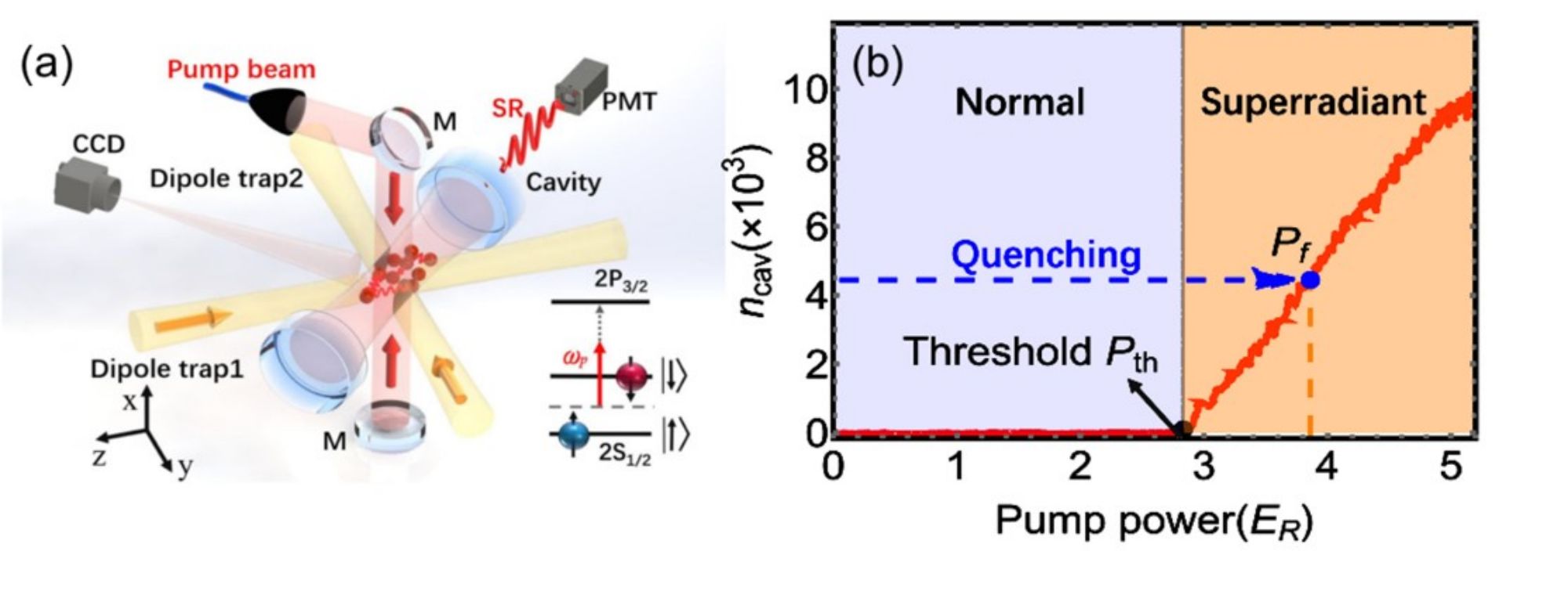 图1:(a)实验装置,(b)量子淬火以及内腔费米超辐射量子相变