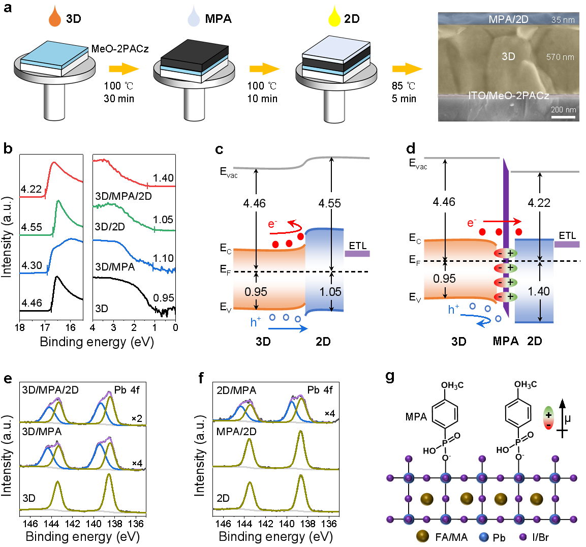 图1. 3D/2D钙钛矿半导体异质结制备、界面电子结构特性。