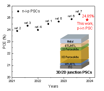 图3. 3D/2D异质结倒置p-i-n器件效率(This work)与3D/2D异质结正置n-i-p器件效率(Ref.)对比。