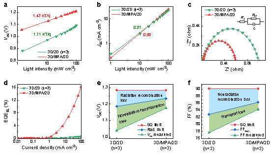 进一步,以此提出了一种钝化偶极桥联Passivating Dipole Bridged的界面调控概念,在3D和2D半导体层之间引入钝化偶极层(PDL),成功调节界面能带,消除电子结构失配,提升电子从3D到2D层的提取效率,并且通过共价键与3D钙钛矿发生强相互作用,钝化表面缺陷,抑制非辐射复合能量损失(图2),最终实现了3D/2D异质结在倒置p-i-n器件效率与3D/2D异质结正置n-i-p器件的效率相当,达到同一水平(图3)。该工作加深了对3D/2D异质结构电子结构与器件性能之间关系的理解。
