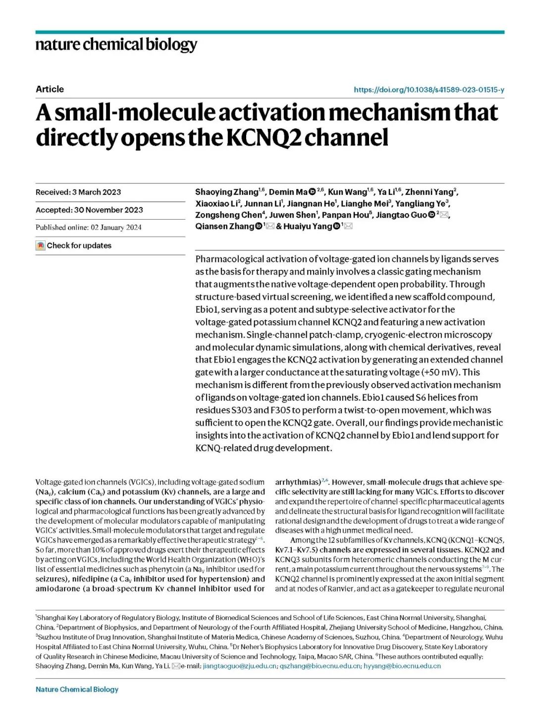 澳门永利皇宫官网入口生命科学学院阳怀宇课题组持续构建离子通道新调控理论,提出“靶向中间态”和“配体-离子直接作用”等非经典调控机制,为离子通道药物设计奠定基础。近日,该团队与浙江大学基础医学院郭江涛课题组合作,揭示了小分子直接打开孔道区的新型调控机制,研究结果于2024年1月2日以"A small-molecule activation mechanism that directly opens the KCNQ2 channel" 为题在线发表于 Nature Chemical Biology 杂志。