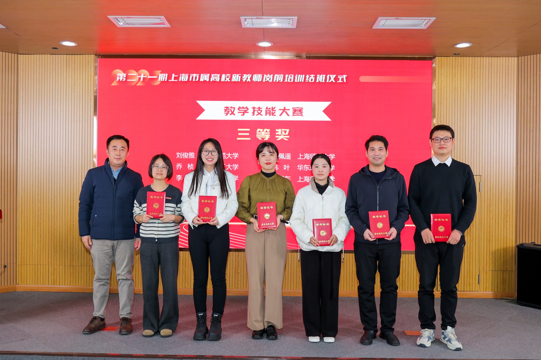 上海师范大学刘俊雅、上海理工大学乔桢、上海理工大学李想、上海师范大学吴佩遥、华东政法大学韩叶、上海师范大学王旭东获教学技能大赛三等奖