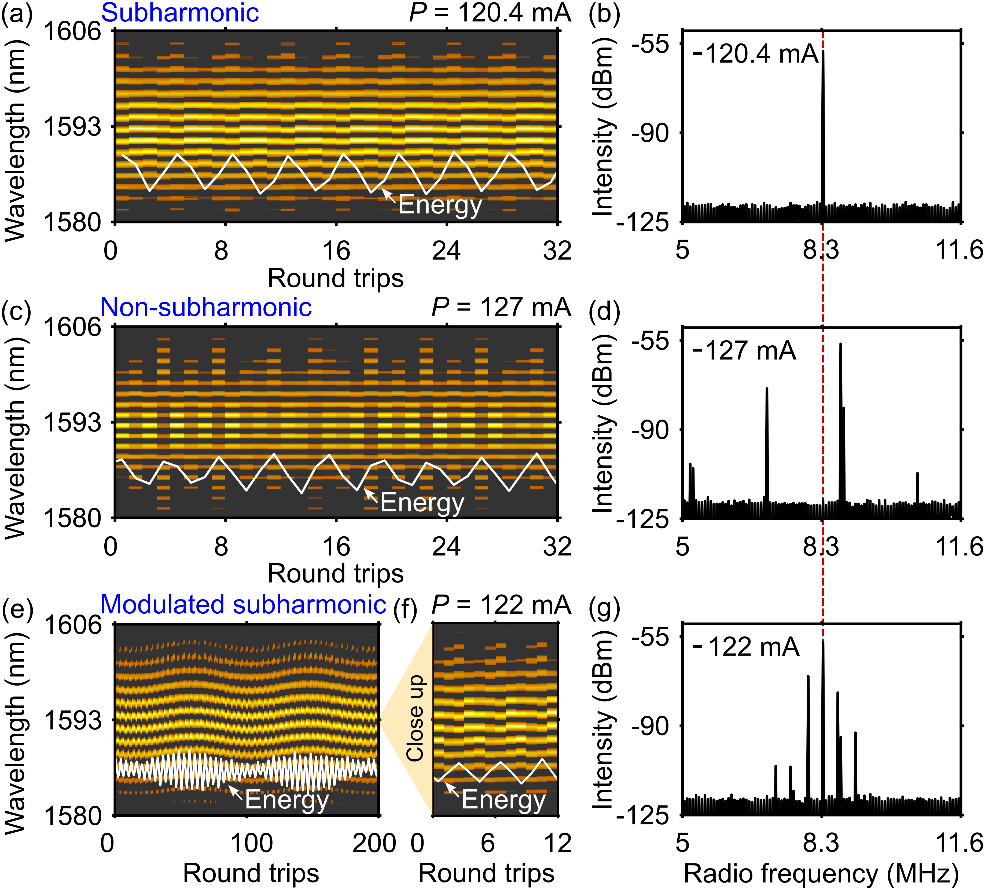 图1:次谐波光谱(a)及射频谱信号(b);非次谐波光谱(c)及射频谱信号(d);调制次谐波光谱(e)及射频谱信号(g),其中(f)是(e)的放大图。图中白色线条代表能量,三种状态下脉冲的能量演化也有很大的不同。