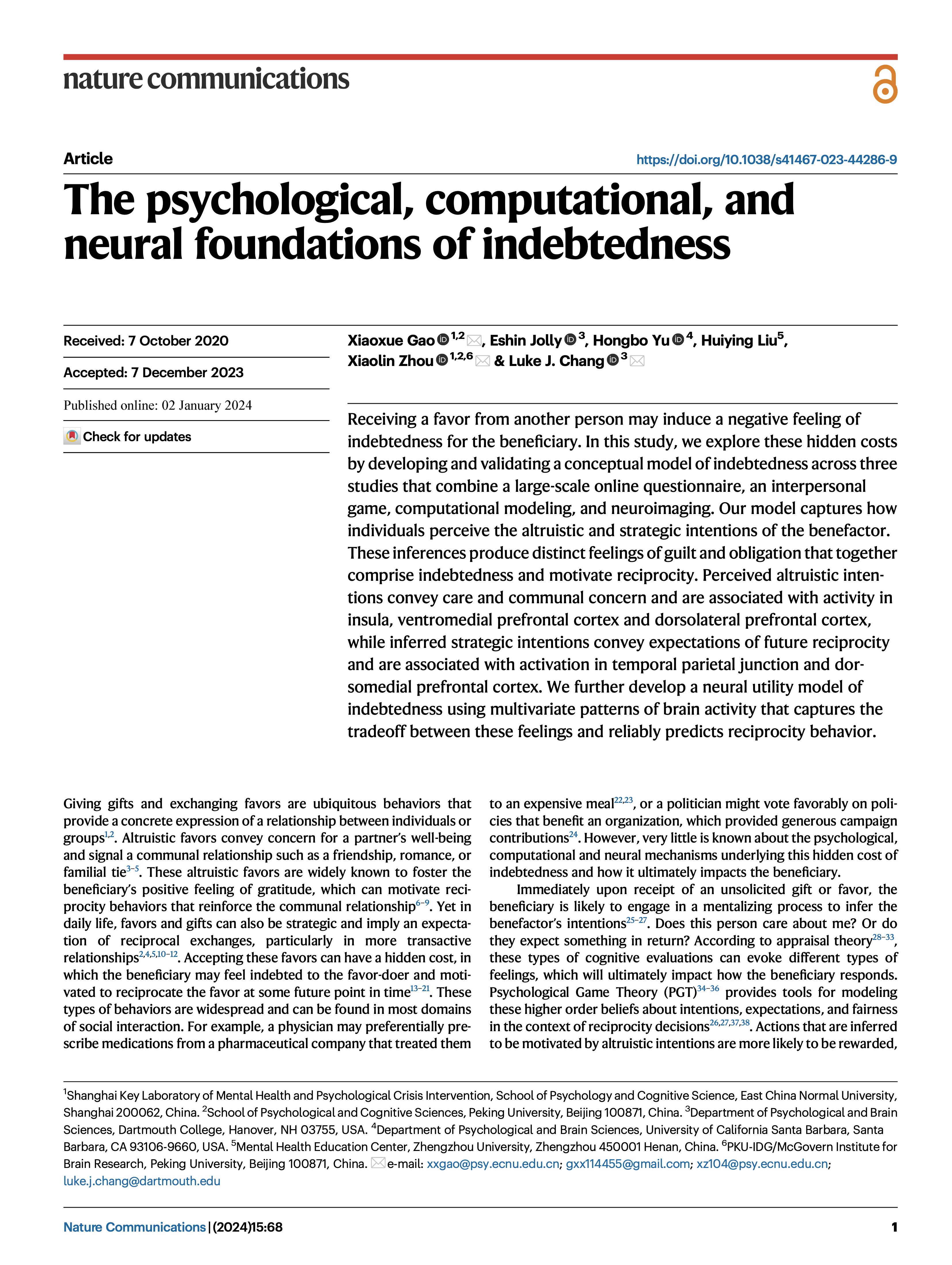 澳门永利皇宫官网入口心理与认知科学学院周晓林教授、高晓雪研究员团队与合作者揭示了人类负债感发生及驱动互惠行为的心理、计算和神经机制;研究成果The psychological, computational, and neural foundations of indebtedness于1月2日在Nature Communications杂志在线发表。澳门永利皇宫官网入口为论文的第一完成单位,高晓雪研究员为该工作第一作者,周晓林教授、高晓雪研究员与合作者达特茅斯学院Luke J. Chang教授为本文的共同通讯作者。