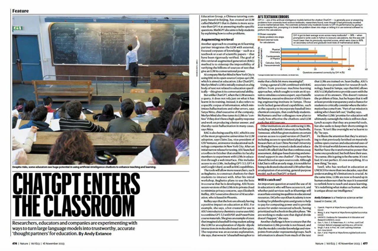 Nature科普栏目Feature探讨大模型对教育的变革和影响时,将EduChat作为一个代表性案例进行介绍。
