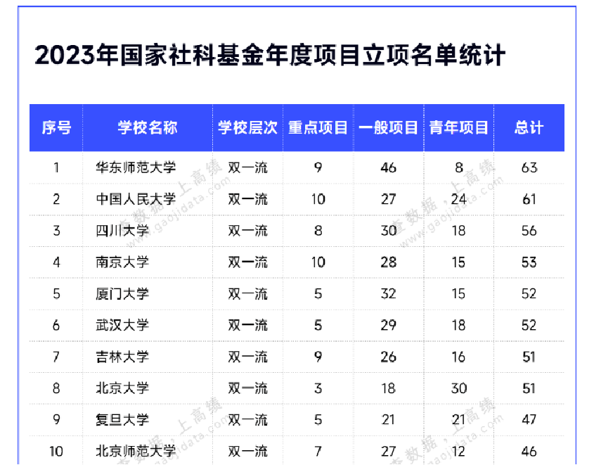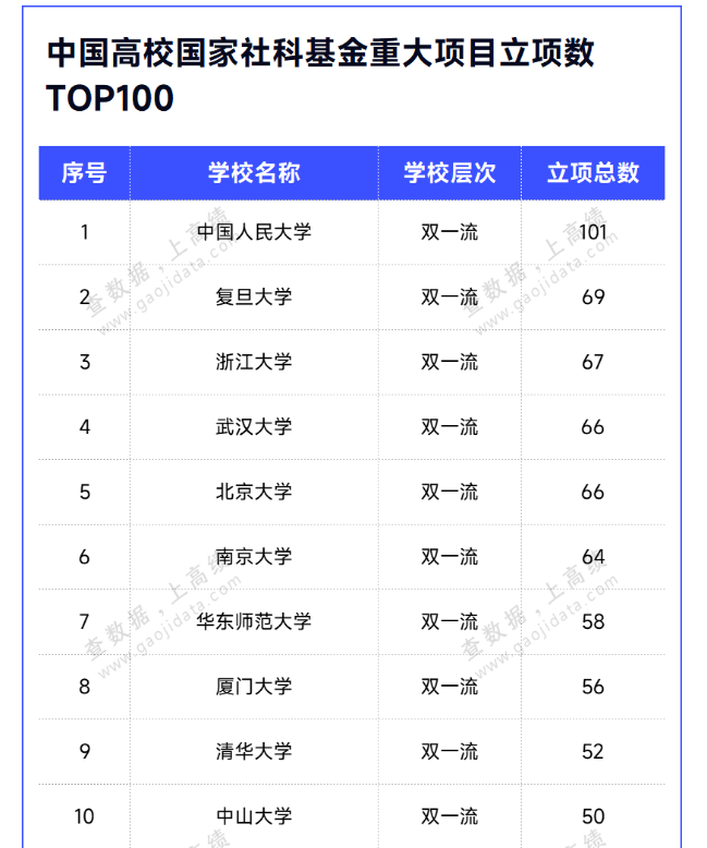 高绩统计了全国高校近五年来国家社科基金重大项目立项情况,华东师大排名第7