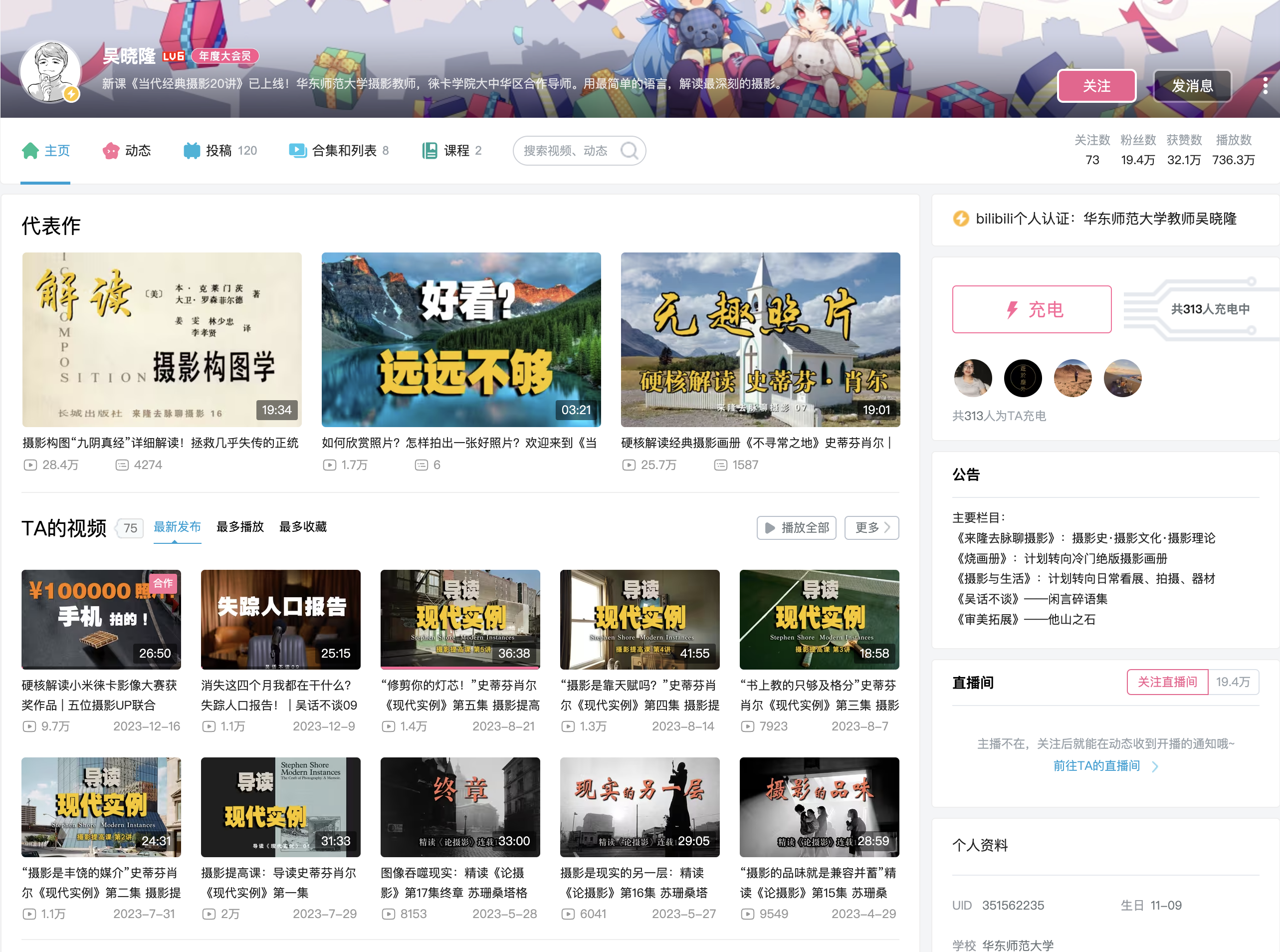 他持续多年在B站更新《来隆去脉聊摄影》节目,该节目以其独特的视角、详实可靠的知识、轻松幽默的风格分享了摄影技巧、理论、历史等知识,迅速吸引了广大学生和网友的关注,让美育教学跨越了校园的界限,以更加生动活泼的形式传播到全国各地。