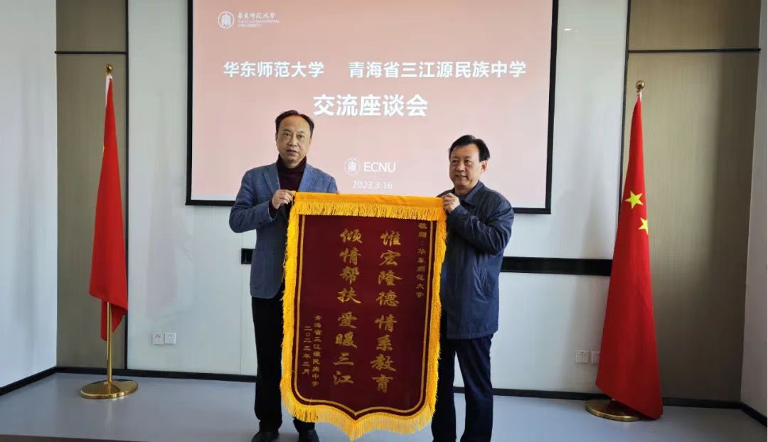 青海三江源民族中学来沪座谈交流,并向华东师大赠送锦旗