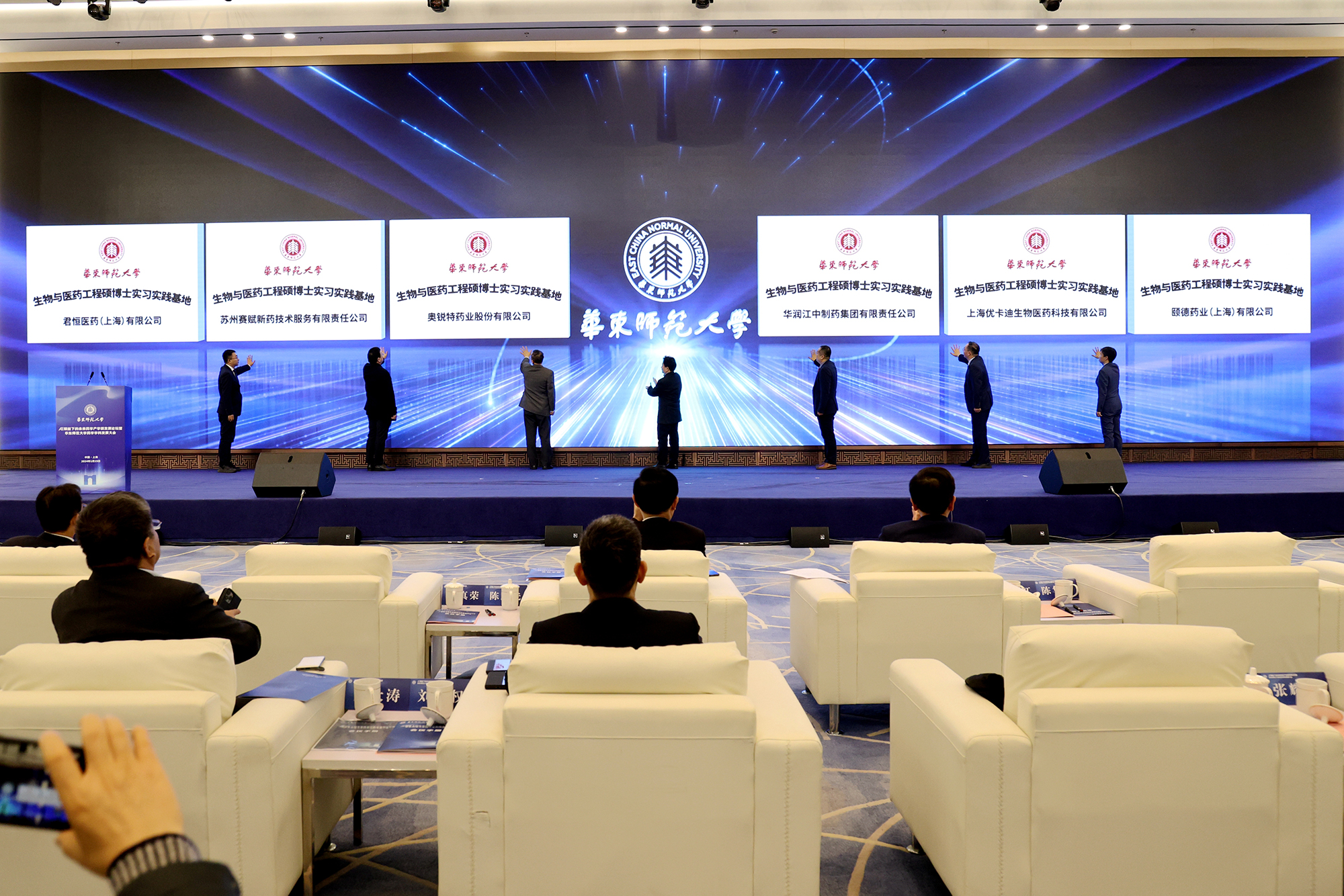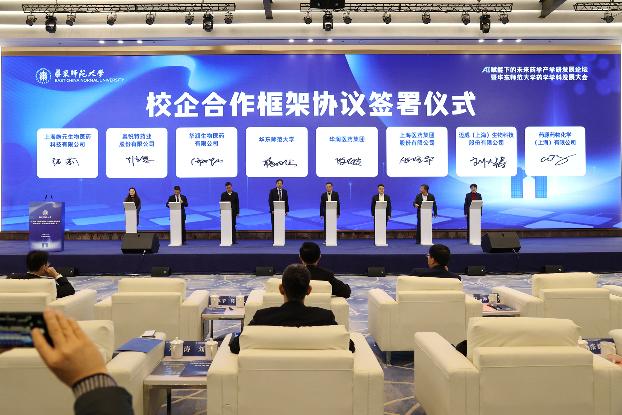会上,学校还和包括上海医药集团股份有限公司、华润医药集团有限公司、华润生物医药有限公司、奥锐特药业股份有限公司、苏州赛赋新药技术服务有限责任公司、颐德药业(上海)有限公司、上海皓元生物医药科技有限公司、药源药物化学(上海)有限公司、君恒医药(上海)有限公司、上海智同医药科技有限公司、上海优卡迪生物医药科技有限公司、迈威(上海)生物科技股份有限公司等十余家生物医药企业签订了合作协议。
