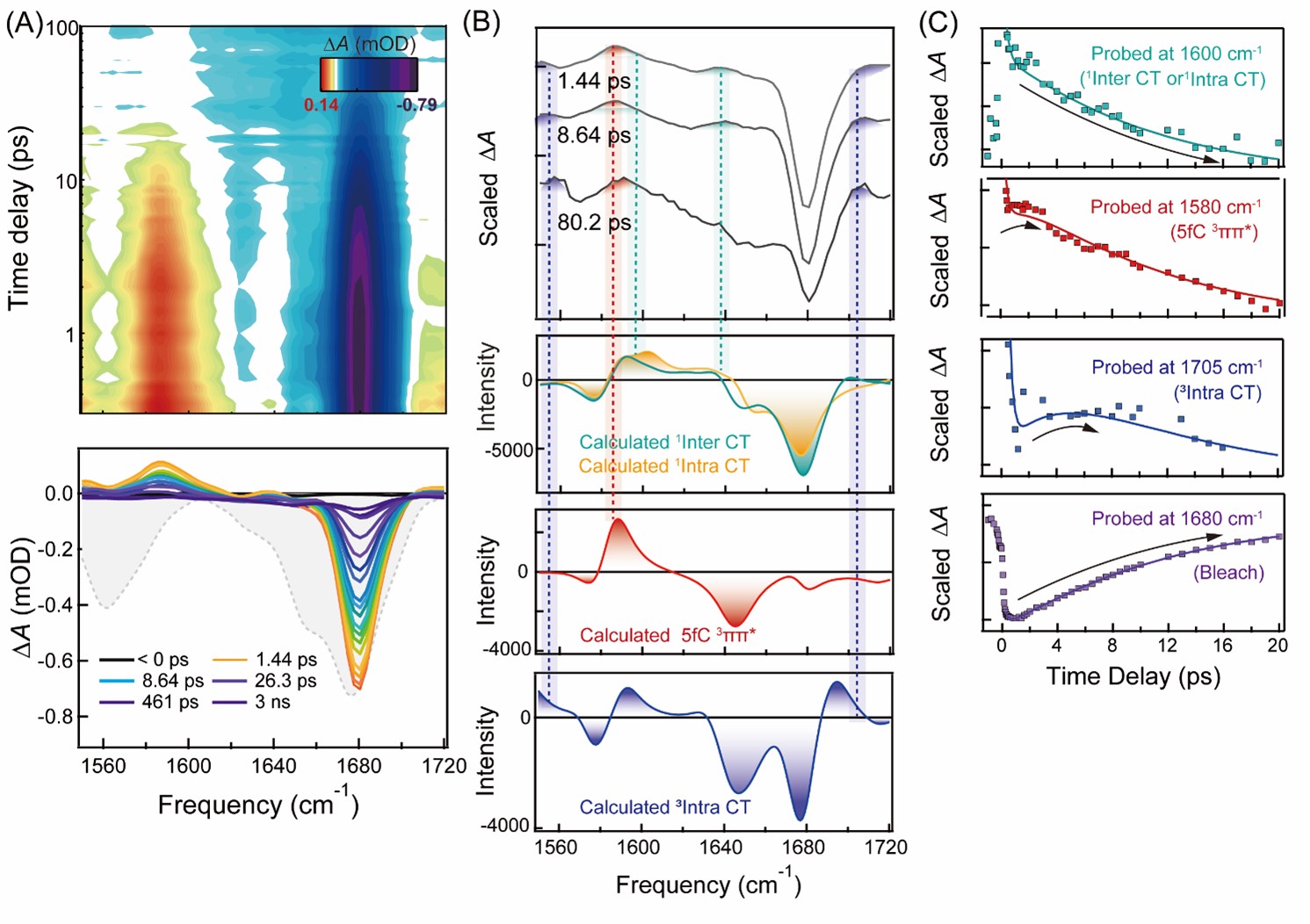 图2. (A)285 nm激发d(G5fC)9•d(G5fC)9双链的时间分辨中红外光谱。(B)具有代表性时间延迟下的实验光谱与理论计算相关激发态光谱对比图。(C)特征波数处的动力学曲线。