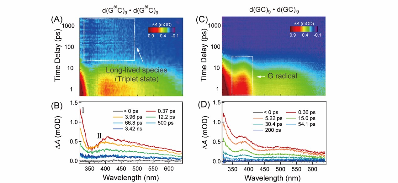 图1. 285nm激发d(G5fC)9•d(G5fC)9双链(A-B)和d(GC)9•d(GC)9双链(D)的飞秒瞬态吸收光谱