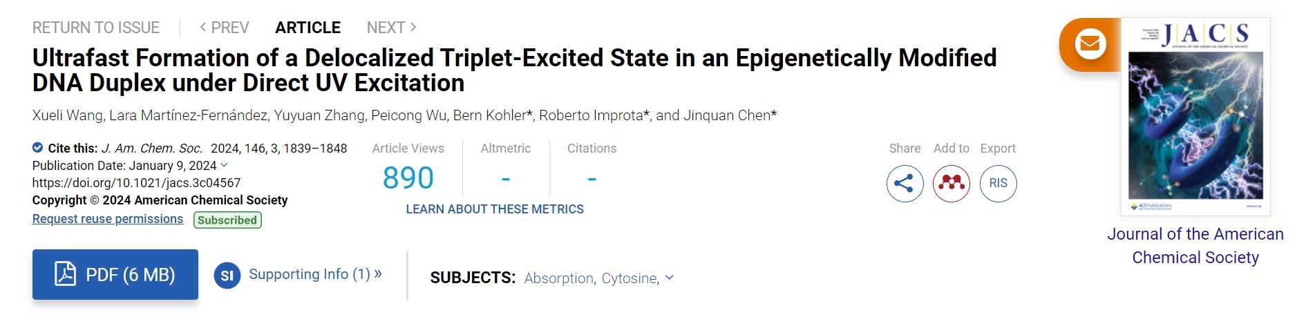 在基因组DNA序列中存在部分具有微小化学结构变化的核酸碱基,这些碱基在基因表达的表观遗传调控中起到至关重要的作用。然而,近年来的研究显示该类碱基会对DNA紫外光稳定性产生威胁。在由于紫外光诱发的皮肤癌中,有大约30%突变位点与该类碱基有关。然而,相关的反应机制尤其是反应初期的激发态动力学过程尚不明晰。该研究团队前期研究主要聚焦于5-醛基胞嘧啶碱基分子。研究显示,该分子受到光激发后发生系间窜跃的速率可达到1011s-1,三重态产率接近100%。(J. Phys. Chem. B 2019, 123, 5782;Chem. Eur. J.2021, 27,10932-10940)这些特性表明5-醛基胞嘧啶可能作为内源性光敏剂诱导DNA中光损伤的产生。