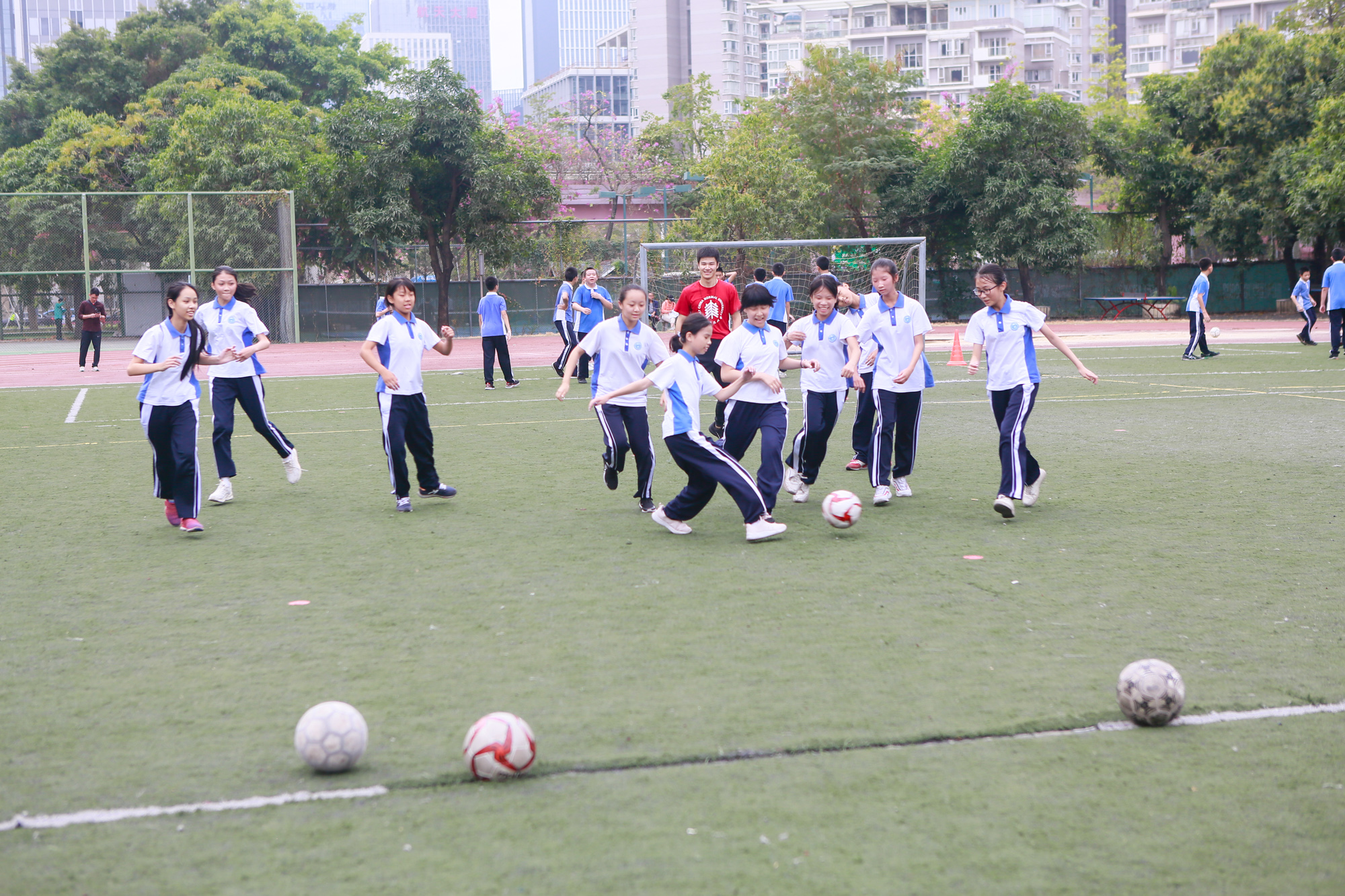 在七年级足球组合技战术展示课上,实习教师巧妙地将足球技术、战术练习,融合到结构化的教学之中,从运球、传球、射门组合练习逐渐过渡到2过1战术基础配合练习,让学生在大汗淋淋中享受将课堂所学内容运用到足球比赛中的乐趣。