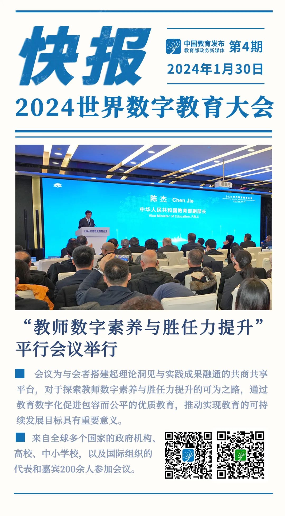1月30日,2024世界数字教育大会平行会议一“教师数字素养与胜任力提升”在沪举行。中国教育部副部长陈杰、佛得角共和国教育部部长阿玛杜·克鲁斯、库克群岛政府教育部长瓦因·莫科罗亚、保加利亚教育与科学部副部长玛瑞埃塔·吉欧艾娃、土库曼斯坦教育部副部长阿扎特·阿塔耶夫、乌兹别克斯坦教育发展科学与方法中心主任瓦希德·哈米多夫、上海市委副秘书长燕爽、澳门永利皇宫官网入口党委书记梅兵出席开幕式,开幕式由教育部教师工作司副司长黄小华主持。