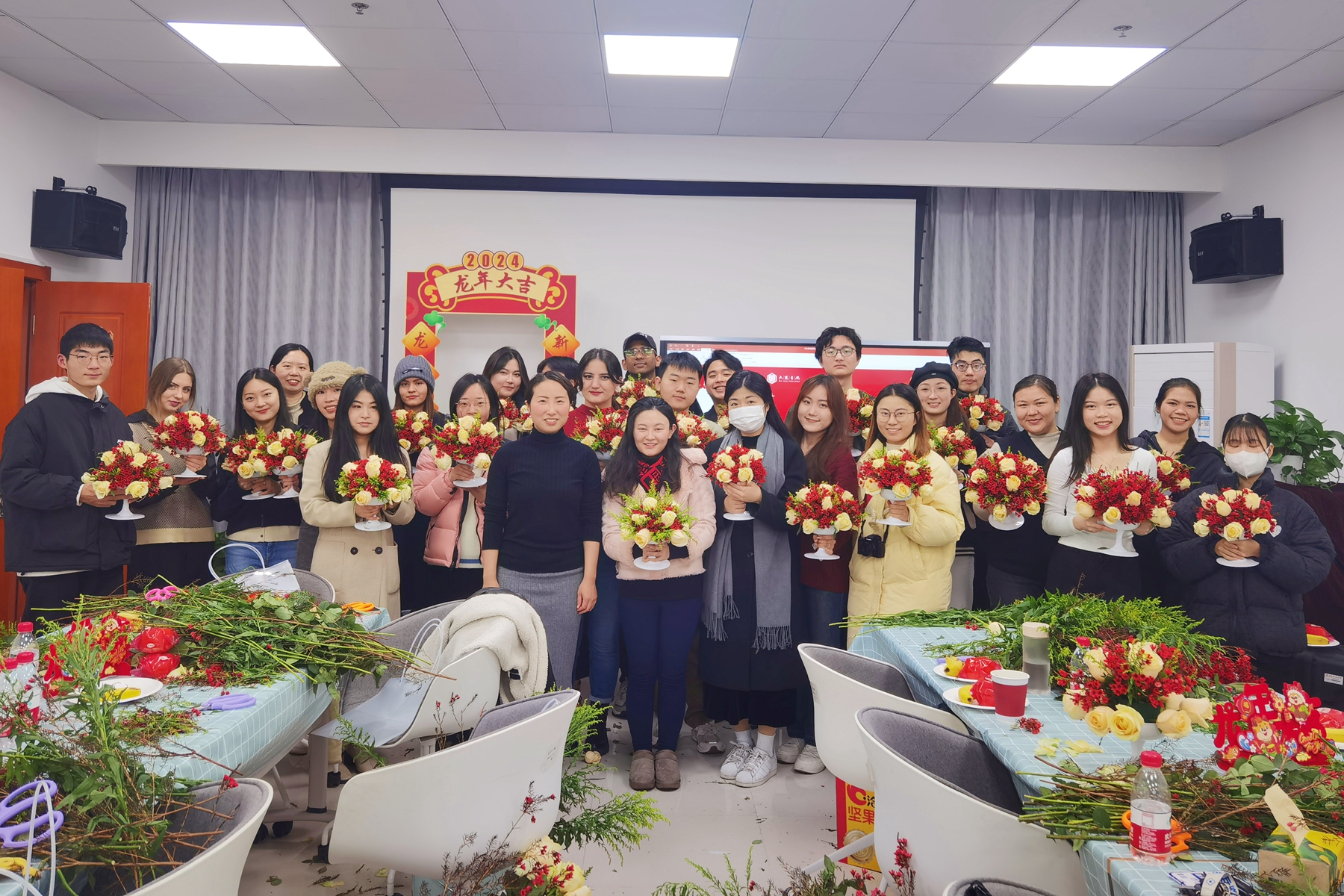 国际汉语文化学院与国际教育中心联合举办新年游园会,200多名中外学生欢聚一堂。学生们参与了踩高跷、丢沙包、投壶、彩绳编织等游戏,也体验了写书法、剪纸等中国传统文化习俗。大家还一起包饺子、做春卷,欢聚庆贺新春的到来。
