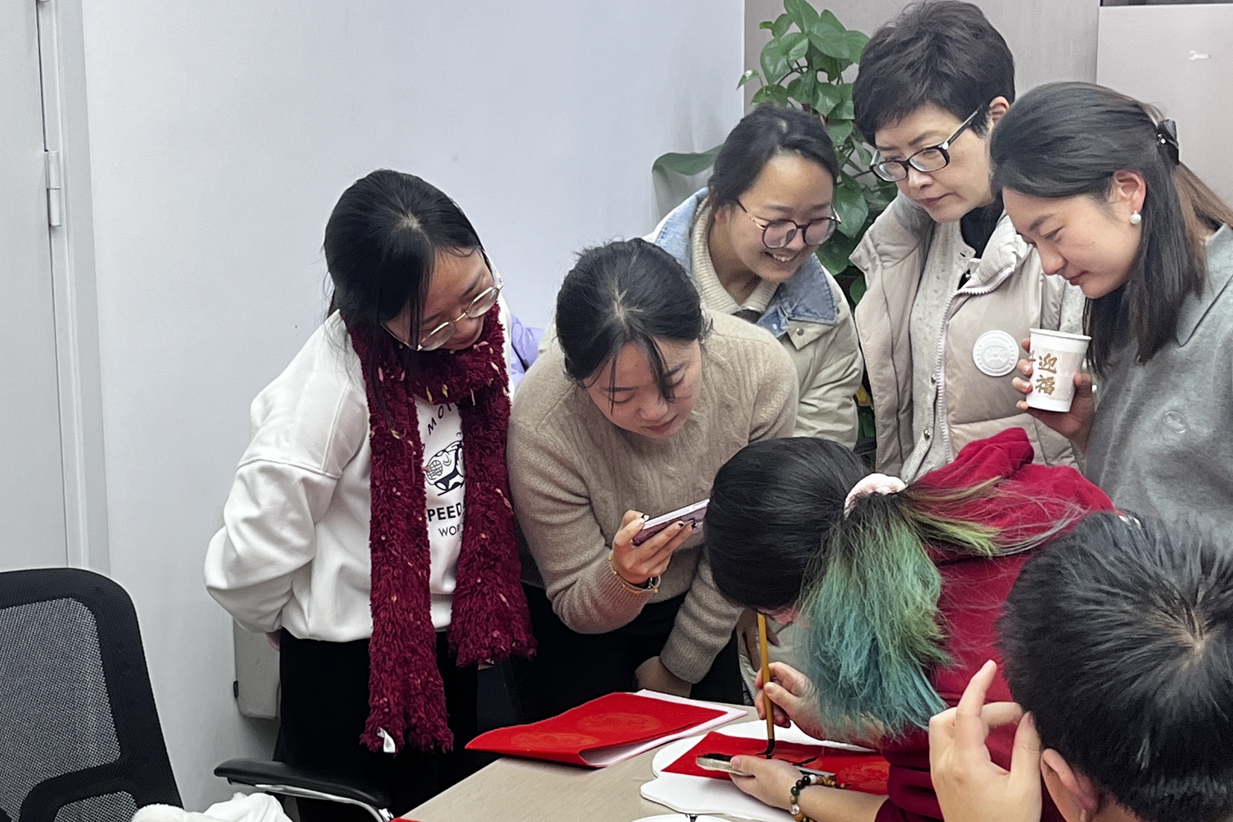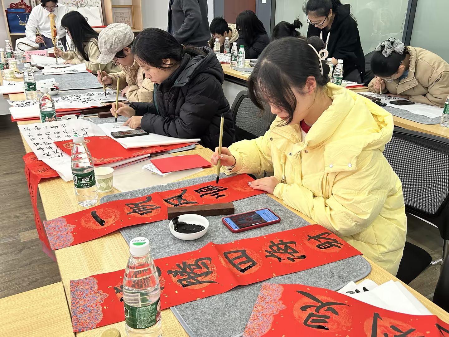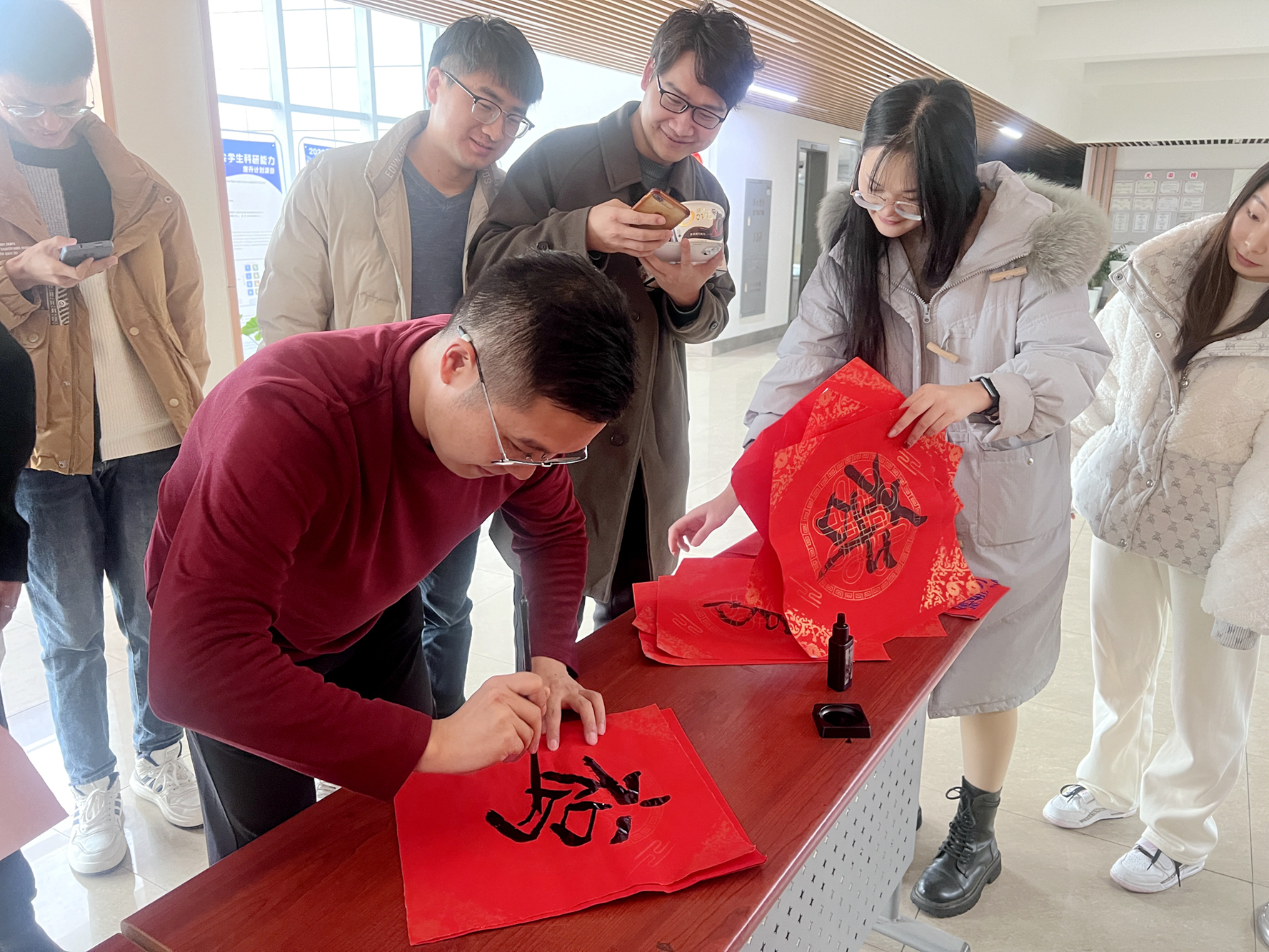 化学与分子工程学院举办了“书香辞旧岁,翰墨迎新春”师生活动。活动现场,墨香四溢,到场师生一同开笔并练习执笔手法后,便迫不及待地投入春联和福字的书写,用笔墨勾勒出一撇一捺,写下心中的一字一句,有对未来一年的美好祝愿,有对科研毕业的满心期待,还有对健康快乐的美丽祝福,处处洋溢着喜庆祥和的欢乐气氛。